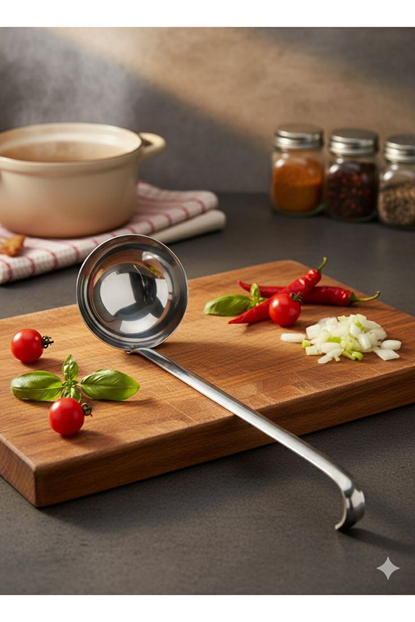 Mutfakta Profesyonel Dokunuş: Paslanmaz Çelik Askılı Kepçe Hem ev mutfaklarında hem de profesyonel işletmelerde uzun yıllar güvenle kullanabileceğiniz bu kepçe, dayanıklılığı ve ergonomik tasarımıyla öne çıkıyor.; Yüksek kaliteli paslanmaz çelikten üretilmiştir, korozyona karşı dirençlidir ve gıda ile temasa %100 uygundur.; Öne Çıkan Özellikler: * Yüksek Malzeme Kalitesi: Kararma yapmayan, parlaklığını koruyan paslanmaz çelik yüzey.; * Ergonomik Tasarım: Uzun sap yapısı sayesinde derin tencerelerde elinizi yakmadan servis yapmanızı sağlar.; * Pratik Askı Çengeli: Sap kısmındaki özel kavis sayesinde tencere kenarına asılabilir veya mutfak askılarına kolayca yerleştirilebilir.; Tencerenin içine düşme sorununu ortadan kaldırır.; * Kolay Temizlik: Bulaşık makinesinde yıkanabilir, hijyeniktir.; * Çok Amaçlı Kullanım: Çorba, sulu yemek, sos ve içecek servisi için idealdir.; UZUNLUK : 40 CM EN : 10 CM