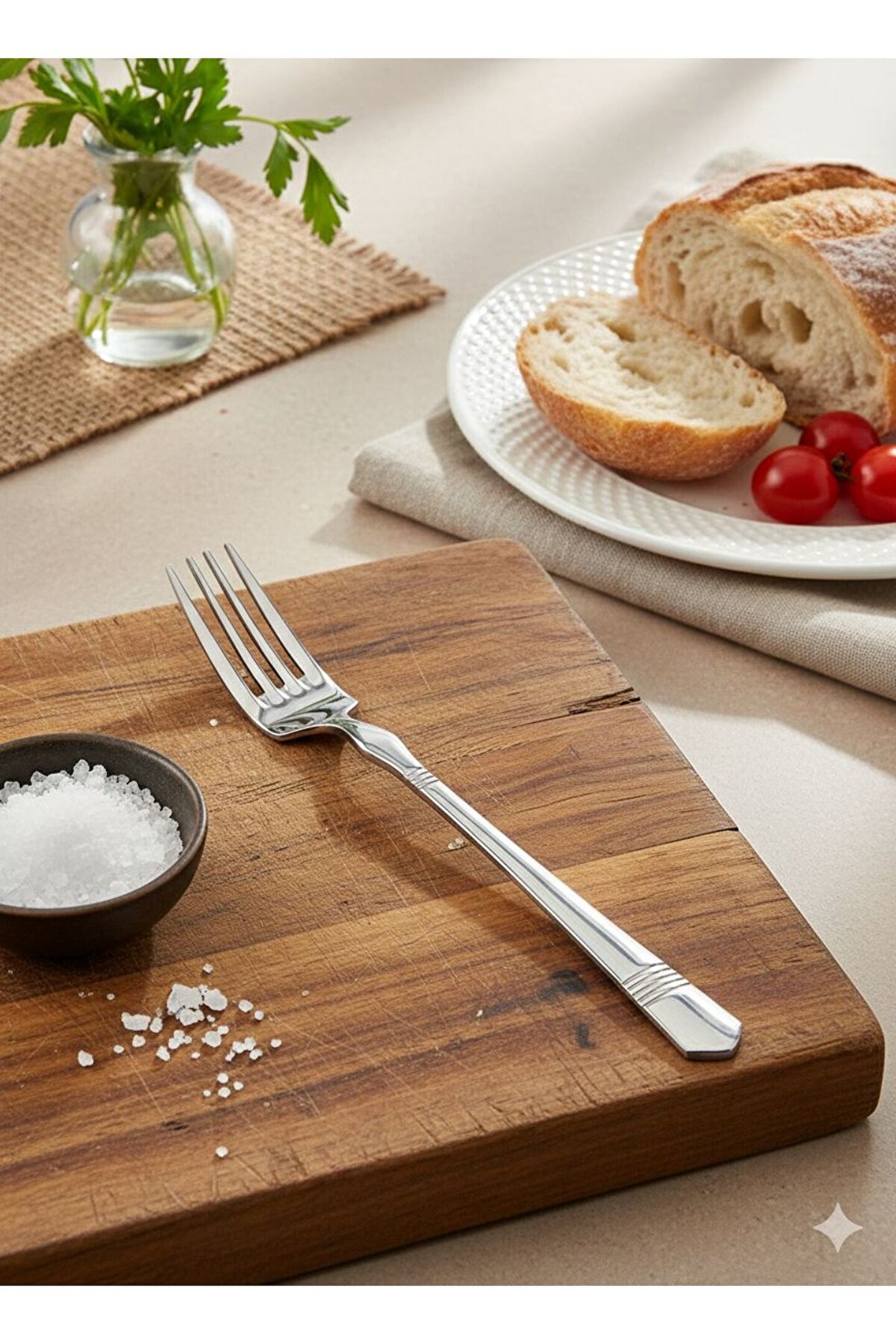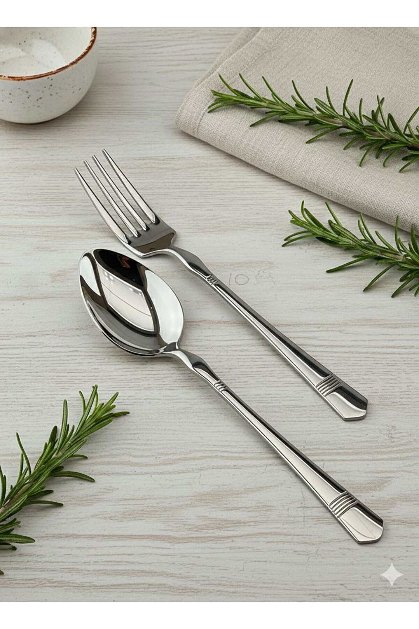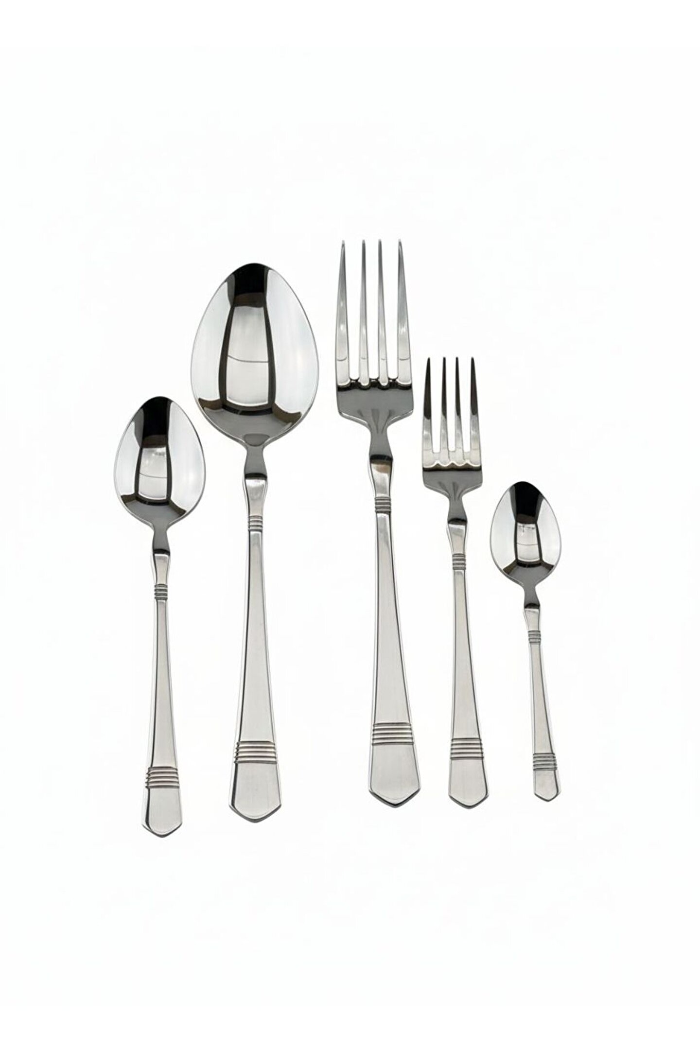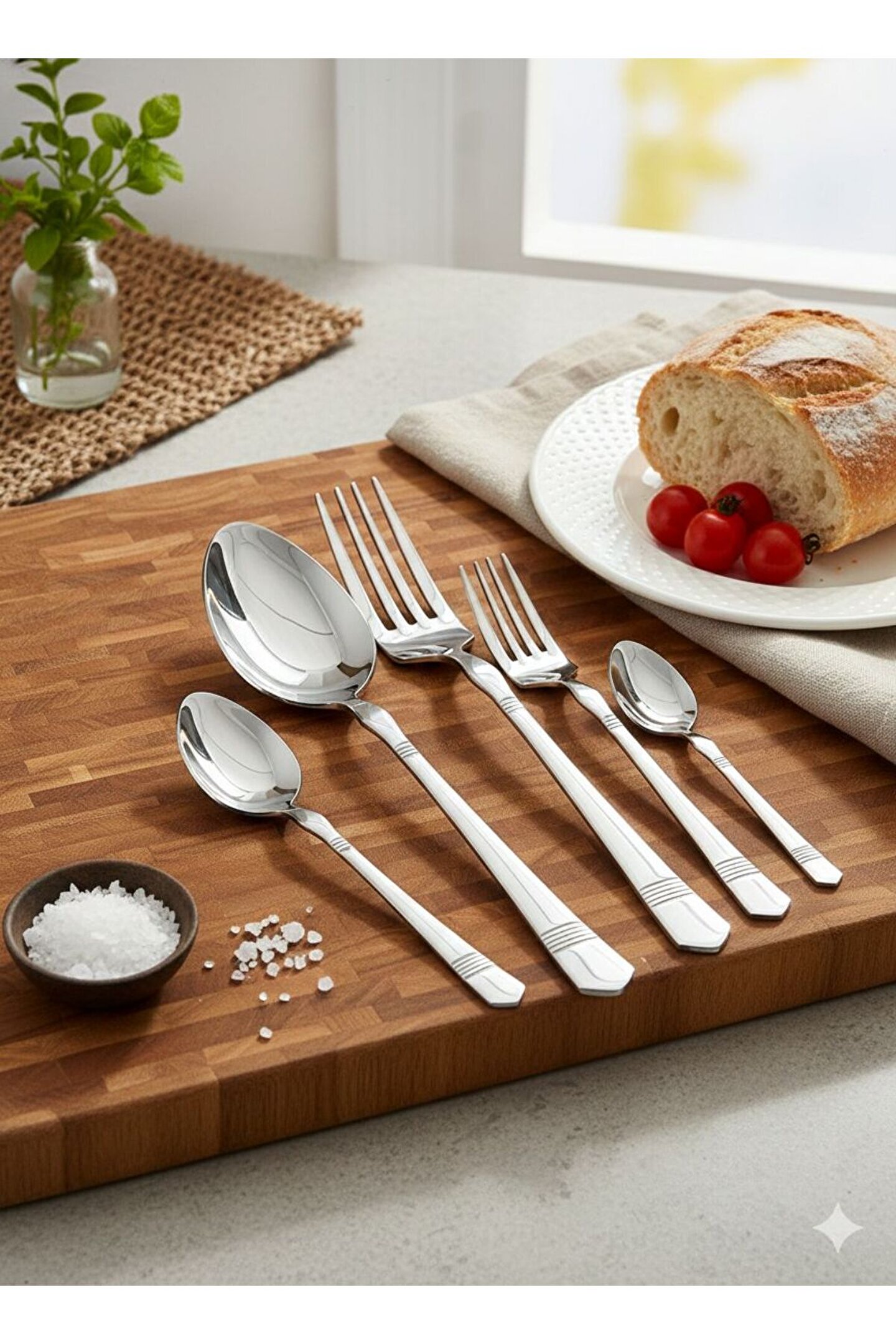 * Malzeme: Yüksek kaliteli paslanmaz çelik (Kararma ve paslanmaya karşı dayanıklı).; * Tasarım: Sap kısımlarında modern 4 çizgili zarif detaylar.; * İçerik: 6 Adet Yemek Kaşığı, 6 Adet Yemek Çatalı, 6 Adet Tatlı Kaşığı, 6 Adet Tatlı Çatalı, 6 Adet Çay Kaşığı.; * Kullanım: Bulaşık makinesinde yıkanabilir, günlük ve özel davetler için uygundur.; * Form: Ergonomik sap yapısı ile konforlu tutuş sağlar.; * 18/10/304