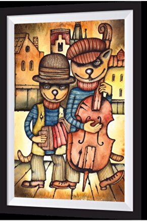 Müzisyen Kediler Sanatsal Çerçeve Görünümlü Ahşap Tablo