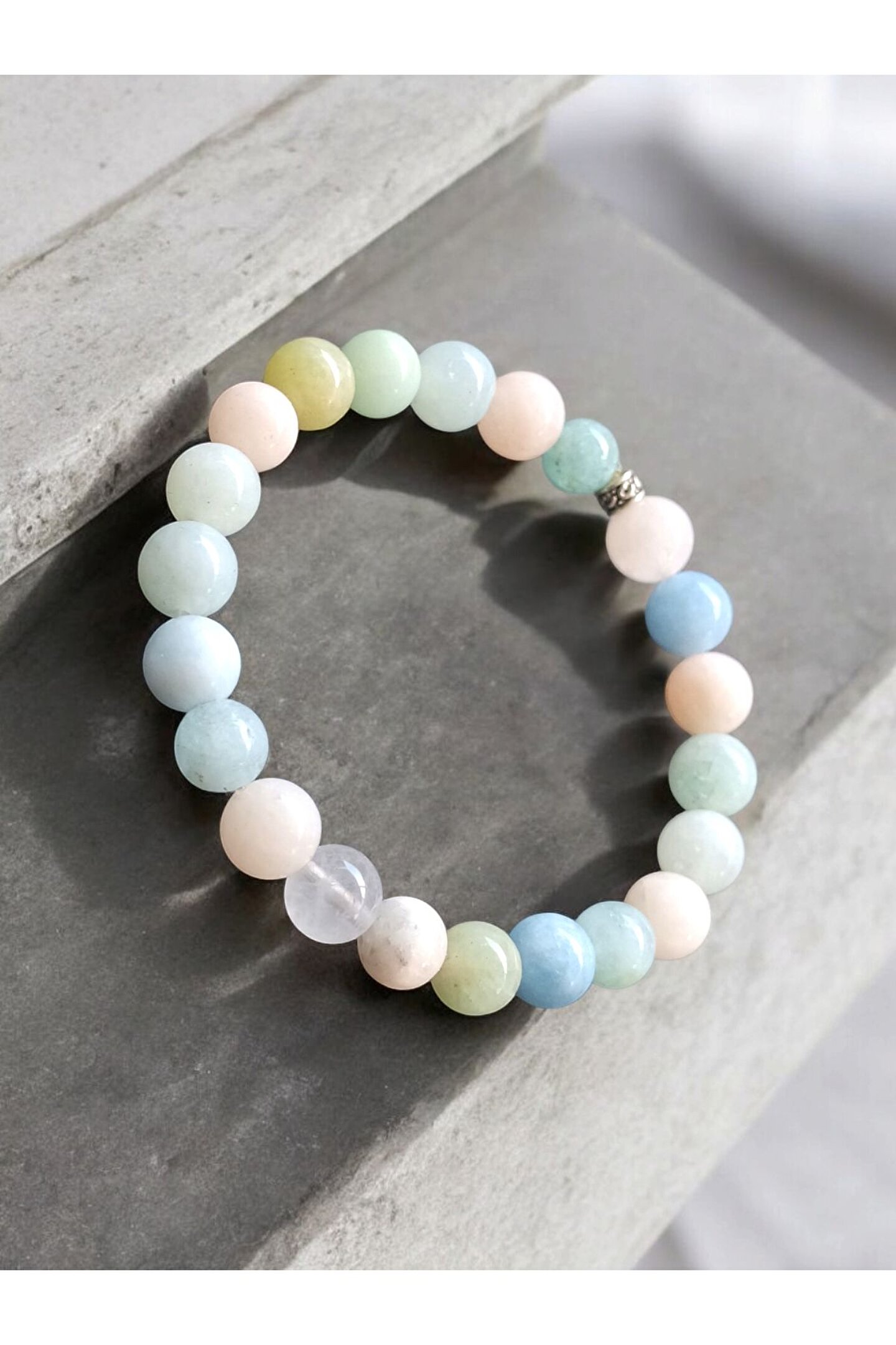Doğal taş morganit taşı bileklik, şıklığınızı tamamlayacak zarif bir aksesuardır; Morganit taşı, benzersiz renk tonları ve desenleriyle dikkat çeker ve her türlü kıyafetle uyum sağlar; Doğal taş kullanımı sayesinde her bileklik benzersizdir ve her biri farklı bir hikaye anlatır; Taşın doğal yapısı, bilekliğe otantik bir görünüm kazandırırken aynı zamanda dayanıklılık sunar; Morganit taşı, enerji taşı olarak bilinir ve pozitif enerjiyi yansıtarak gün boyu yanınızda taşıyabileceğiniz bir aksesuar haline gelir;