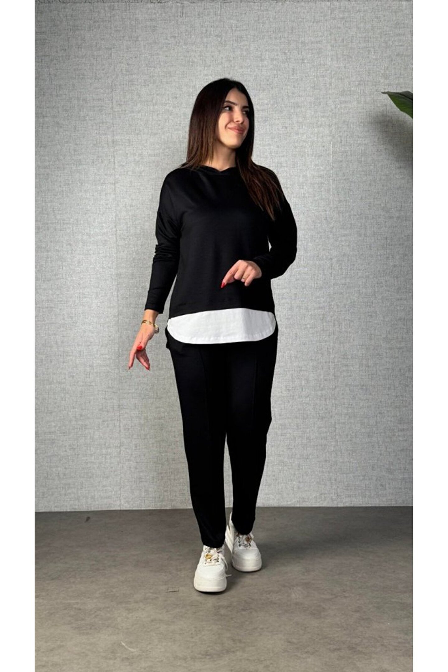 Kadın Uzun Kollu Kapşonlu Bağcıklı Viskon Iki Iplik Bluz Ve Pantolon Ikili Takım