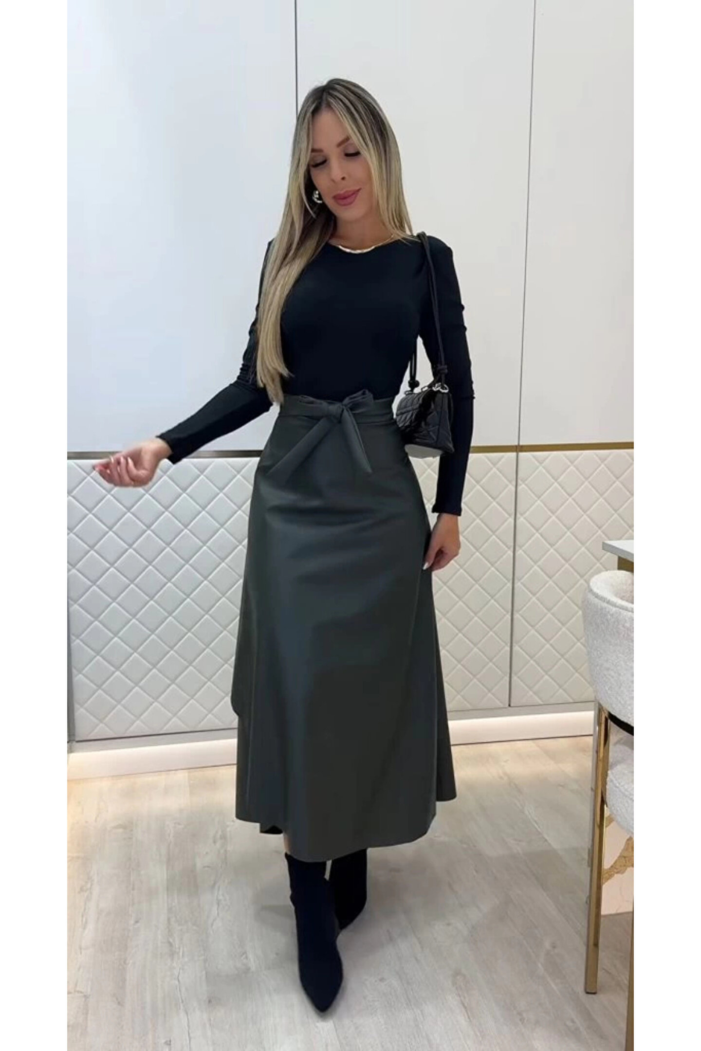 Kadın Belden Kuşaklı Uzun Deri Etek