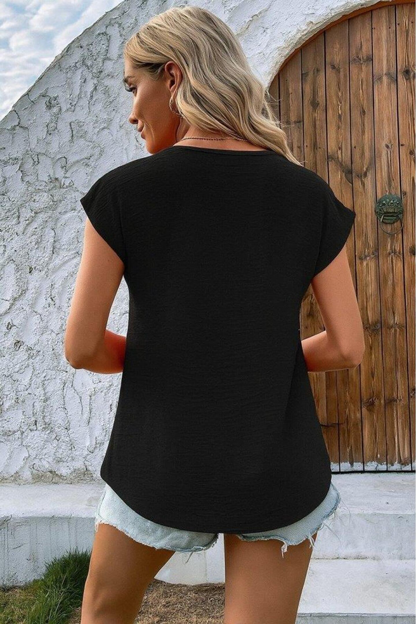 Kadın Kısa Kollu V Yakalı Düğmeli Keten Bluz