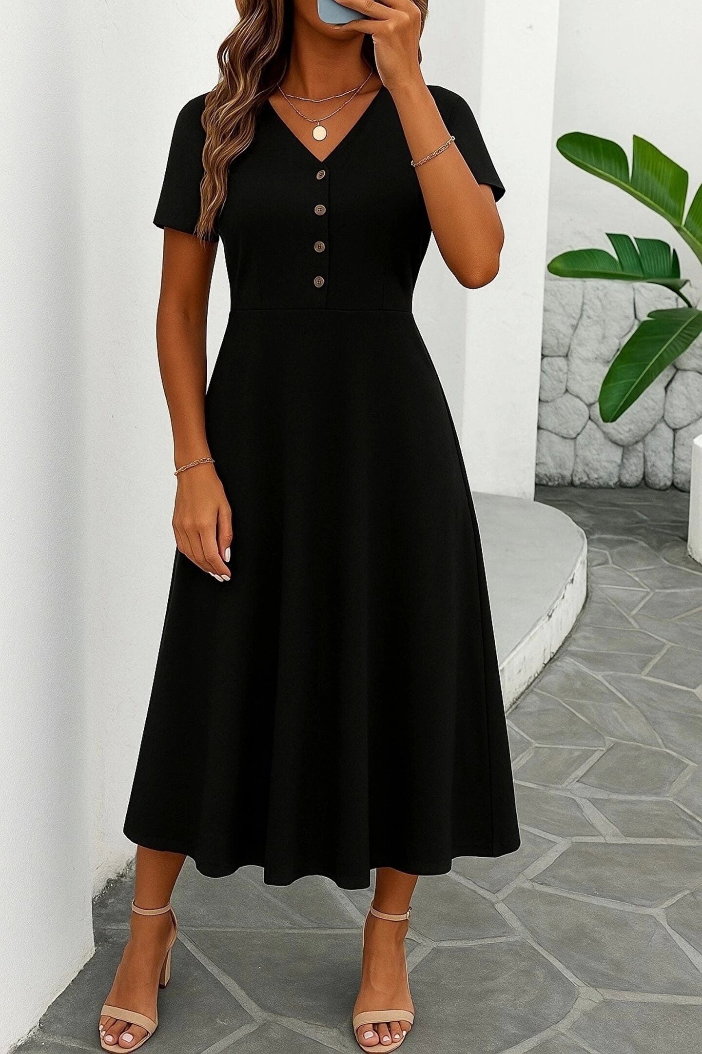ALPACO Kadın Kısa Kollu V Yakalı önden Düğmeli Yırtmaçlı Midi Viskon Elbise