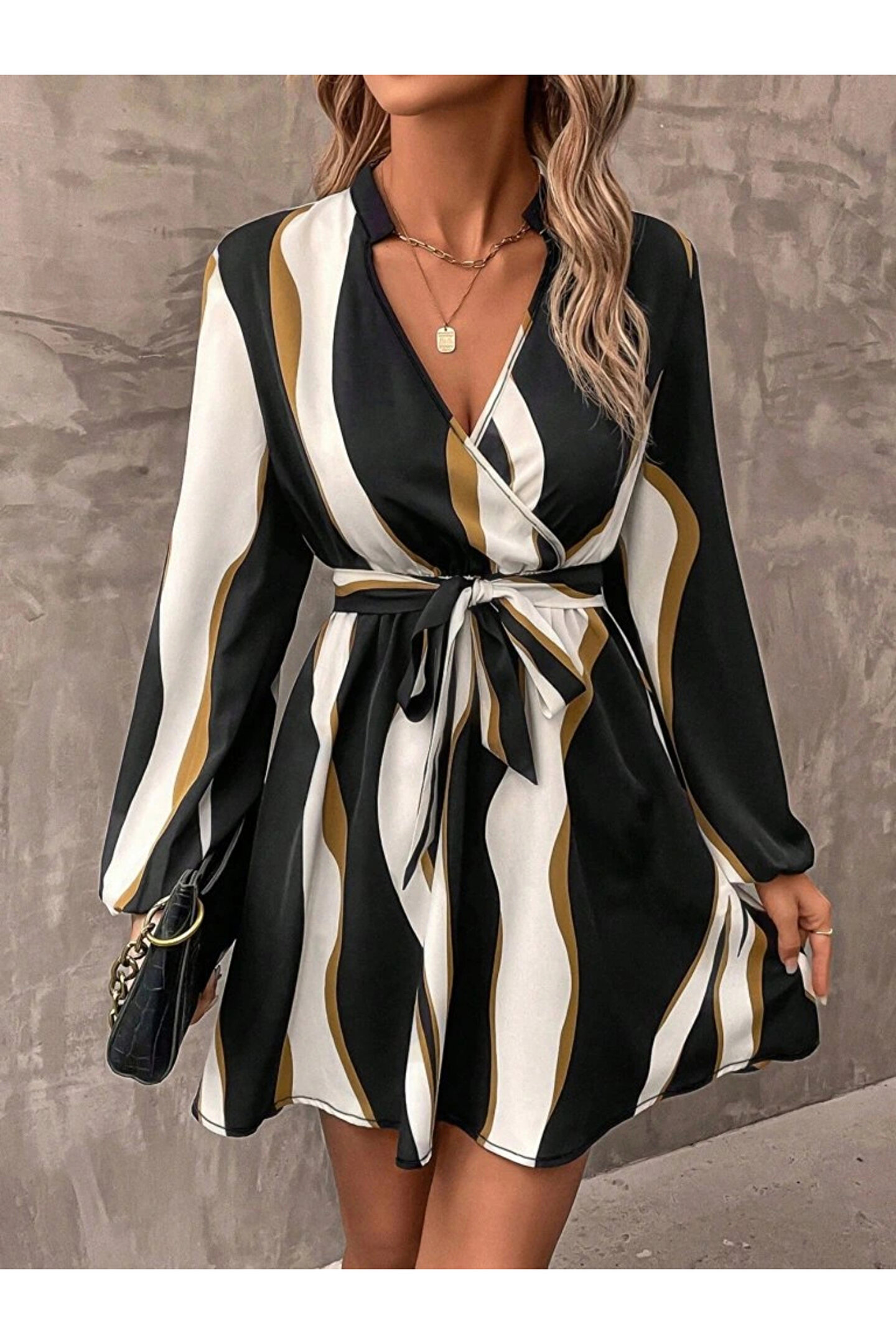 Kadın Uzun Kollu Kruvaze Yakalı Desenli Modal Mini Elbise
