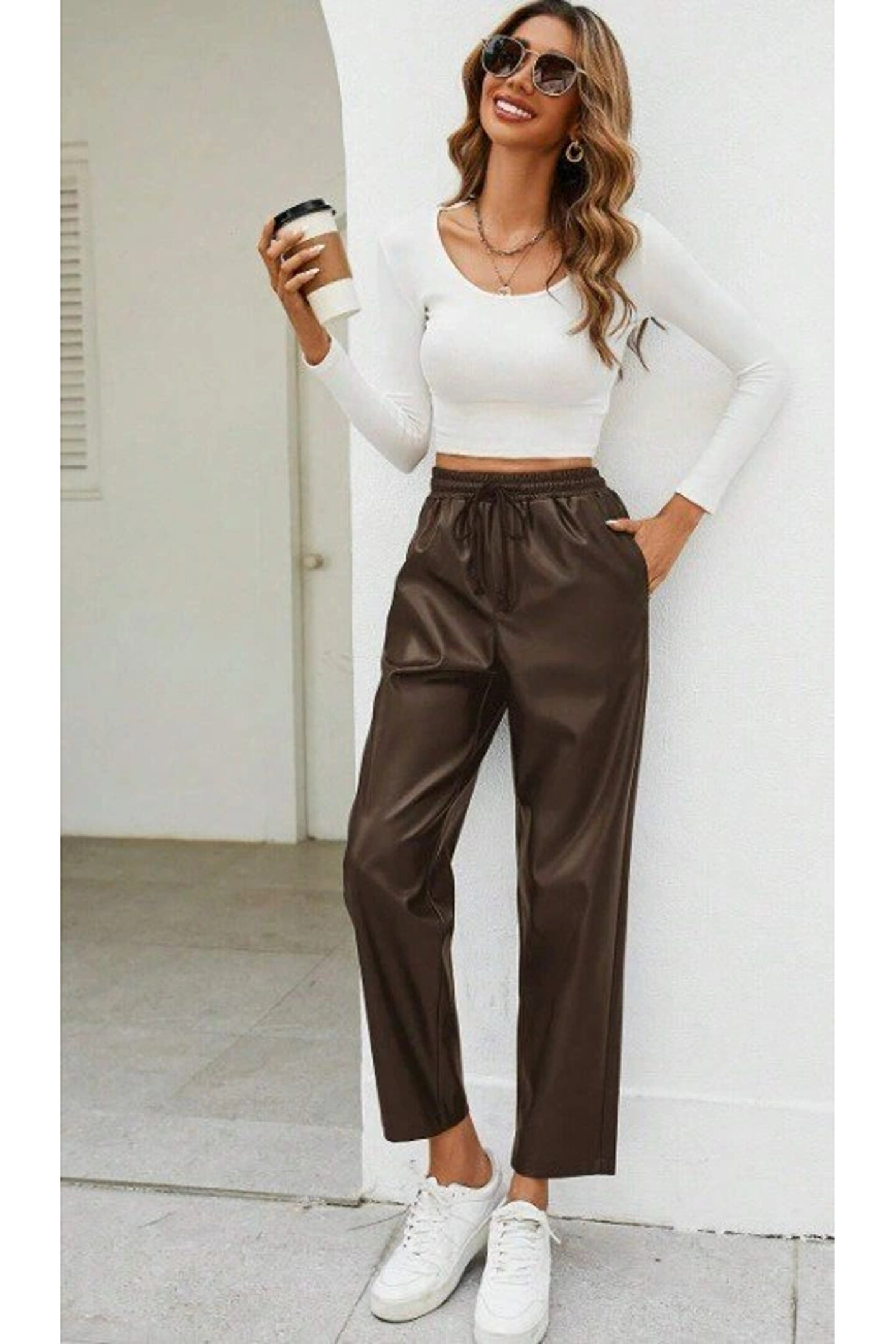 ALPACO Kadın Yüksel Bel Bağcıklı Deri Pantolon