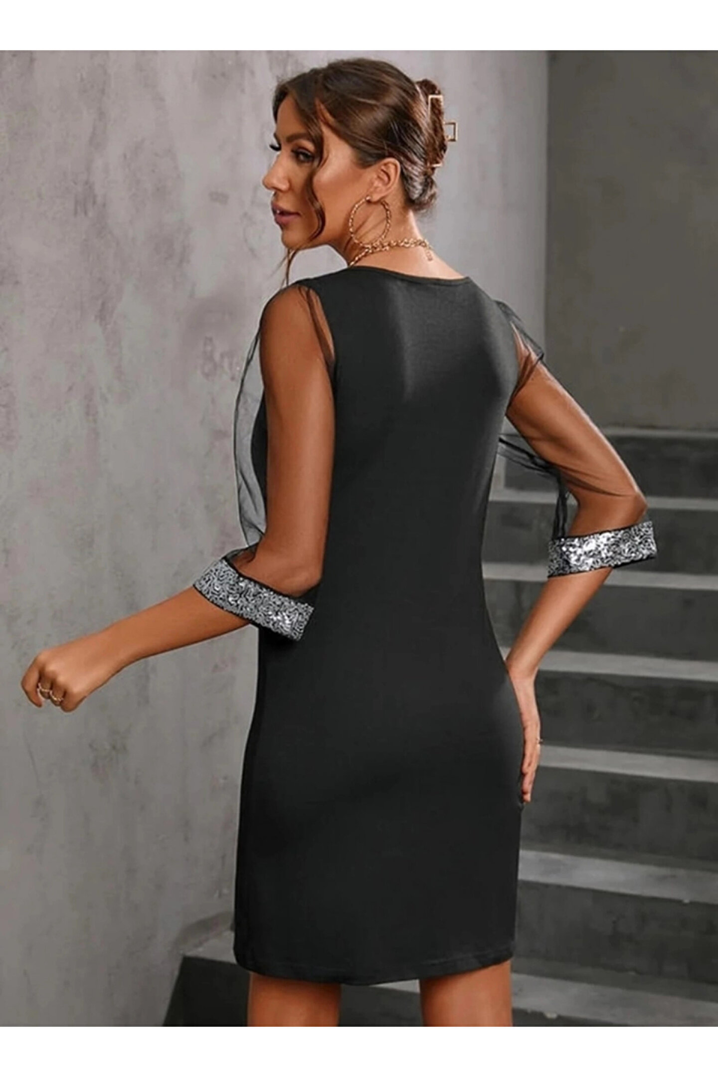 ALPACO MDB Kadın Uzun Kollu V Yaka Ve Kol Ucu Pul Payet Krep Elbise