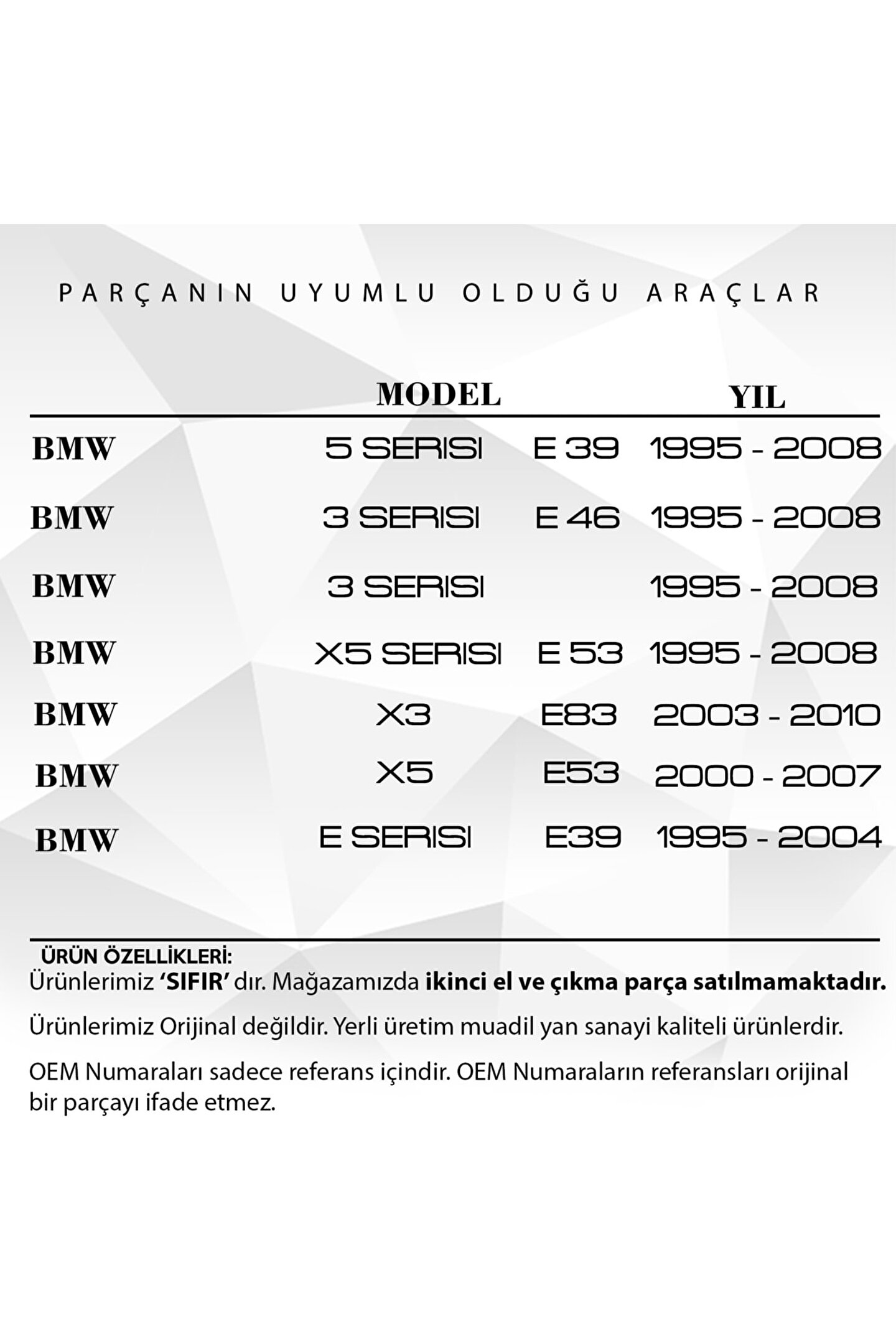 BMW E39. E46.E53 için Sunroof Perdesi Tamir Seti - 10 Parça.; Bu 10 parçalı Araba Sunroof Perdesi Tamir Seti, arabanızın sunroof perdelerini hızlı ve kolay bir şekilde tamir etmenizi sağlar.; Set, dayanıklı ve uzun ömürlü malzemelerden üretilmiştir, bu yüzden güvenle ve tekrar tekrar kullanabilirsiniz.; Bu tamir seti, geniş bir araç yelpazesine uyacak şekilde tasarlanmıştır, bu yüzden aracınızın modeli ne olursa olsun, perde tamir ihtiyaçlarınızı karşılayabiliriz.; Tamir işlemi sırasında gereken tüm aletleri içeren bu set, size zaman ve enerji tasarrufu sağlar.; Kullanımı kolay ve montajı basittir, bu nedenle profesyonel olmasanız bile sunroof perdenizi kolayca tamir edebilirsiniz.; Arabanızın iç mekanını güneş ışığından ve sıcaktan korumak için ideal bir çözümdür.; Ürün Kodu: SR2326