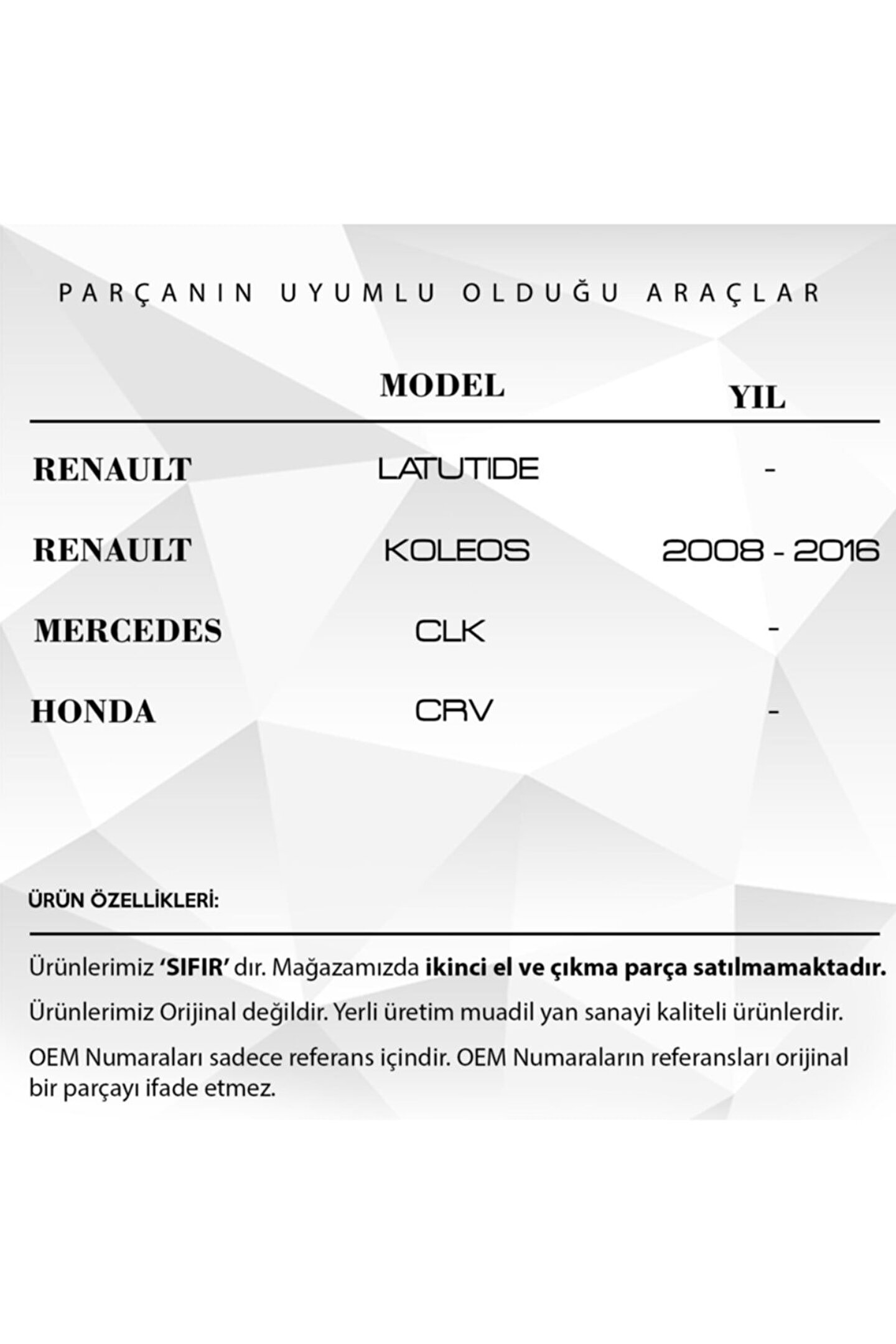 Honda CRV için Panaromik Sunroof Cam Tavan Tamir Seti (4'lü set).; Araba Panaromik Sunroof Cam Tavan Tamir Seti, aracınızdaki cam tavanın bakımı ve onarımı için mükemmel bir çözümdür.; Bu 4'lü set, panaromik sunroof'unuzun performansını artırmak ve uzun ömürlü kullanım sağlamak için gereken her şeyi içerir.; Üstün kaliteli malzemelerden üretilmiştir ve her bir parça, dayanıklılığı ve güvenilirliği garanti eder.; Yüksek kaliteli tamir seti, çizikler, çatlaklar veya diğer hasarları hızlı ve etkili bir şekilde tamir etmenize yardımcı olur.; Kullanımı kolaydır ve profesyonel sonuçlar elde etmek için tüm gereken aletleri içerir.; Bu set, aracınızın sunroof'unun maksimum verimlilikte çalışmasını sağlar.; Araba Panaromik Sunroof Cam Tavan Tamir Seti, aracınızı yeni gibi görünmesini ve hissettirmesini sağlar.; Ürün Kodu: SR2260-3