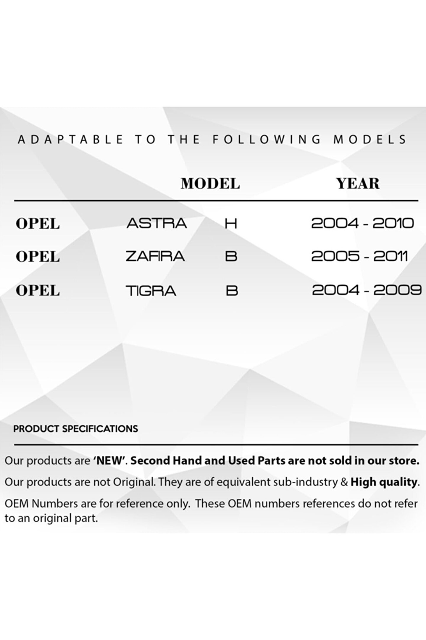 Opel Astra H.; Zafira.; Tigra B için Cam Düğmesi Kapağı.; Opel Astra H, Zafira ve Tigra B araçları için uyumlu olan bu cam düğmesi kapağı, aşınmış veya kırılmış düğmeleri yenilemek için tasarlanmıştır.; Yüksek kaliteli plastik malzemeden üretilmiş olup, dayanıklı yapısı sayesinde uzun ömürlü kullanım sunar.; Montajı kolay olup, profesyonel yardım gerektirmeden kısa sürede takılabilir.; Ergonomik yapısı sayesinde sürücülere ve yolculara konforlu bir kullanım sunar.; Bu ürün, aracınızın iç mekanına hem estetik hem de işlevsel bir çözüm kazandırır.; Ürün Kodu: WB2241
