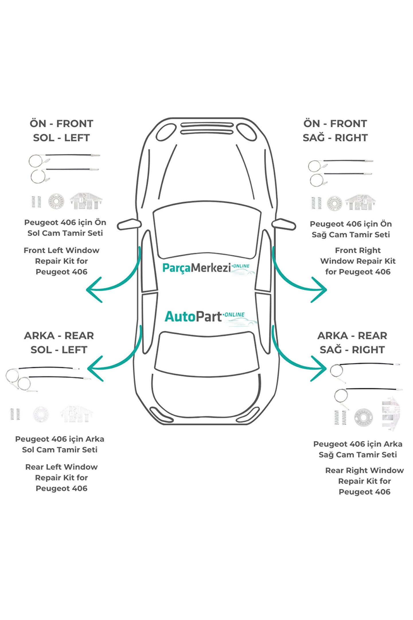 Peugeot 406 için Arka-Ön Cam Tamir Seti-Sağ-Sol-SET.; Araba Arka-Ön Cam Tamir Seti-Sağ-Sol-SET, aracınızın camlarının bakımını ve tamirini kolaylaştırır.; Bu set, her türlü aracın ön ve arka camlarının bakımı ve tamiri için tam bir çözüm sunar.; Araç camınızı tamir etmek için gerekli olan tüm aletleri içerir, bu sayede tek bir setle tüm işlerinizi halledebilirsiniz.; Kendi kendinize yapabileceğiniz tamirler için ideal bir seçenektir.; Araba Arka-Ön Cam Tamir Seti-Sağ-Sol-SET, aracınızın camlarını ilk günkü gibi gösterir ve görüş alanınızı netleştirir.; Bu ürün, aracınızın ömrünü uzatır ve sürüş güvenliğinizi artırır.; Yüksek kalite standartlarında üretilmiştir ve dayanıklı malzemelerden yapılmıştır.; Bu sayede, aracınızın bakımı ve tamiri için uzun süre güvenle kullanabilirsiniz.