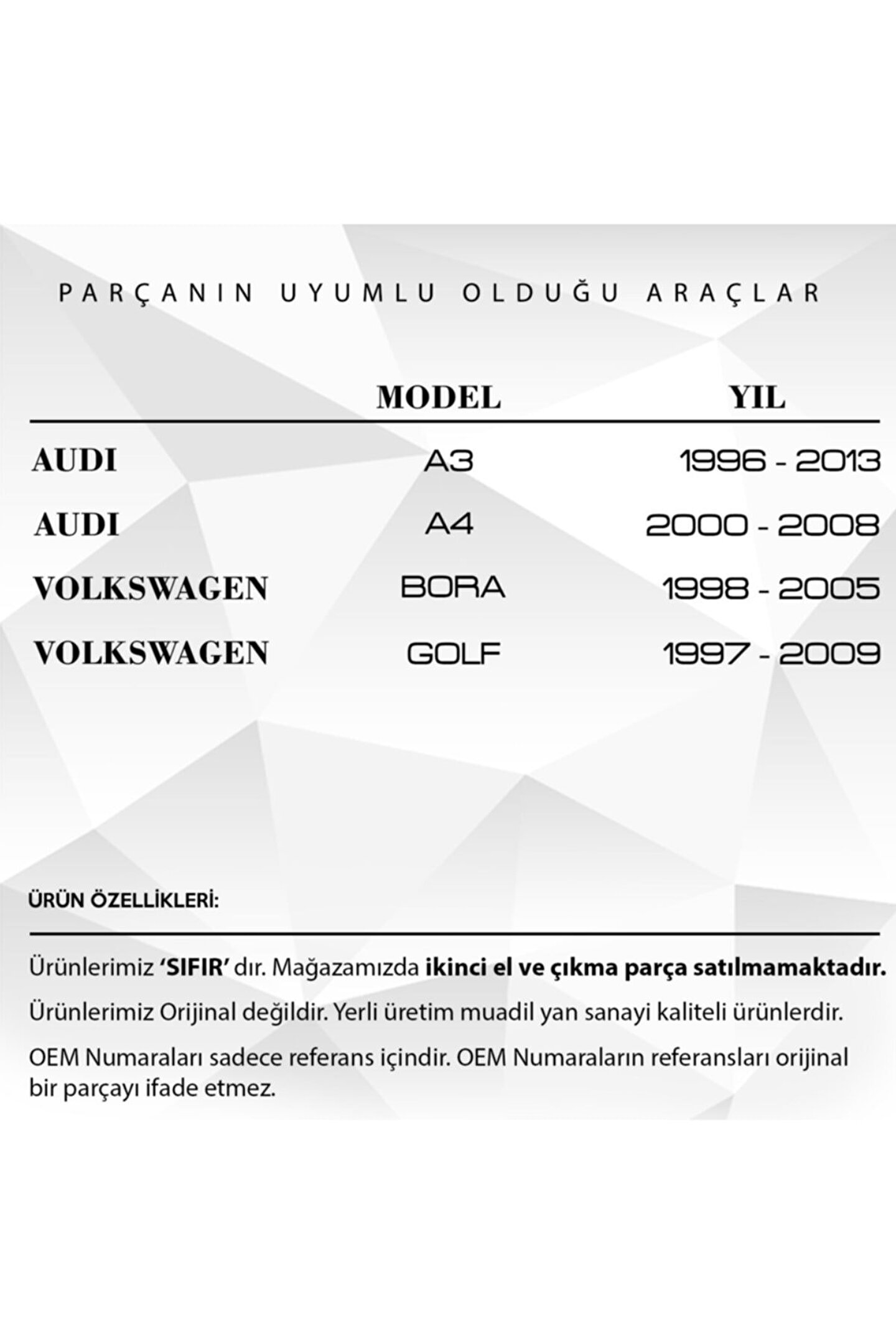 VW Golf.; Seat Leon.; Audi A3 için Su Tahliye Tapası ve Oringi.; Araba Su Tahliye Tapası ve Oringi, aracınızın motorunun sağlıklı çalışmasını sağlamak için özenle tasarlanmış bir üründür.; Ürün Kodu: MTR2285 olan bu ürün, motorun aşırı ısınmasını önlemeye yardımcı olurken aynı zamanda soğutma sistemini de verimli bir şekilde çalıştırır.; Araba Su Tahliye Tapası ve Oringi, kolay kurulum özelliği sayesinde araç sahiplerinin hayatını kolaylaştırır.; Bu ürün, motorun ömrünü uzatırken aynı zamanda yakıt tüketimini de azaltır.; Sadece yüksek kaliteli malzemelerden üretilmiştir, bu da onun dayanıklılığını ve güvenilirliğini garanti eder.; Araba Su Tahliye Tapası ve Oringi, aracınızın performansını artırırken aynı zamanda uzun süreli kullanım için mükemmel bir seçimdir.; Bu ürün, hem şehir içi hem de şehir dışı sürüşlerde aracınızın