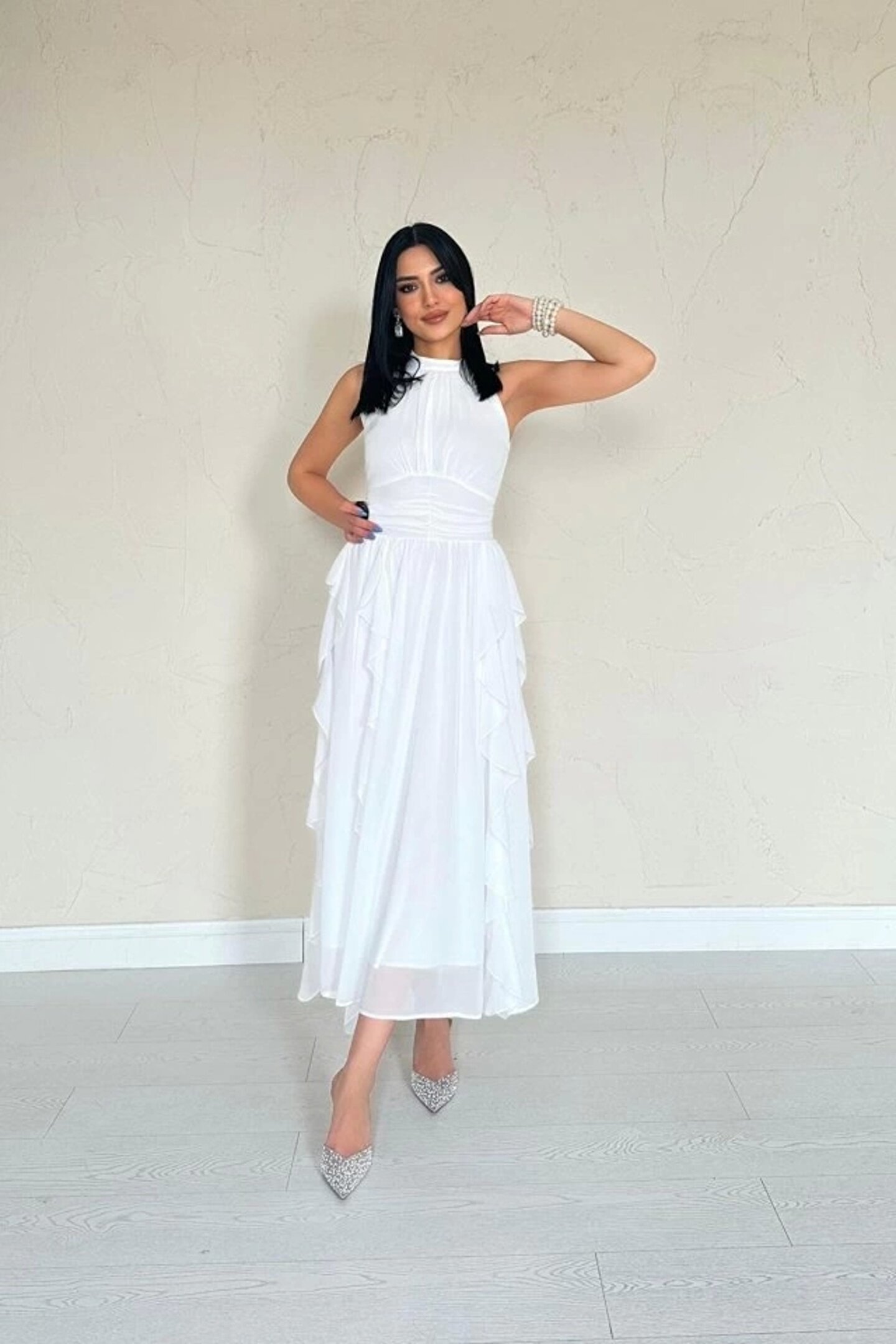 Amara Boutique Beyaz Önü Büzgülü Fırfırlı Elbise
