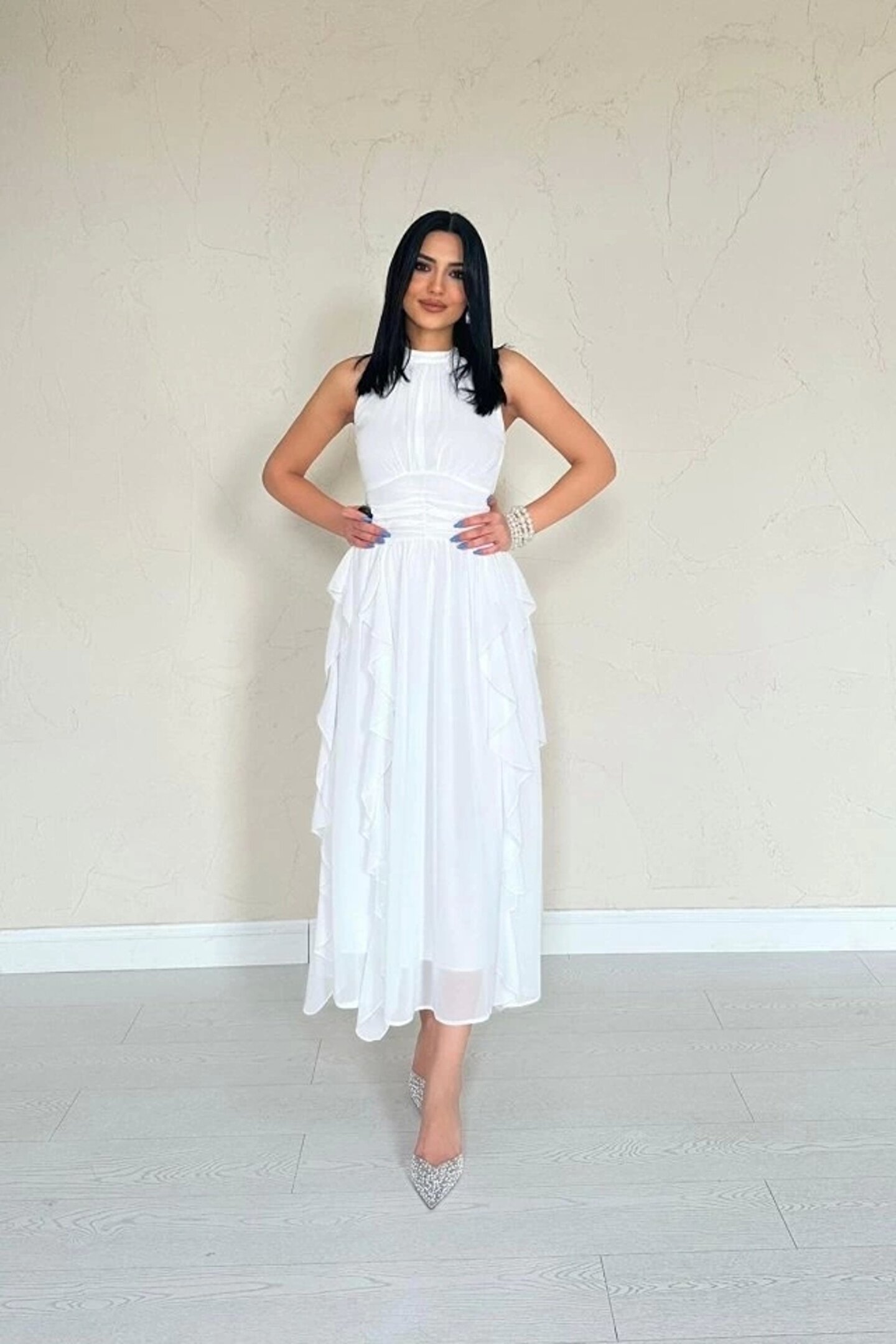 Beyaz Önü Büzgülü Fırfırlı Elbise