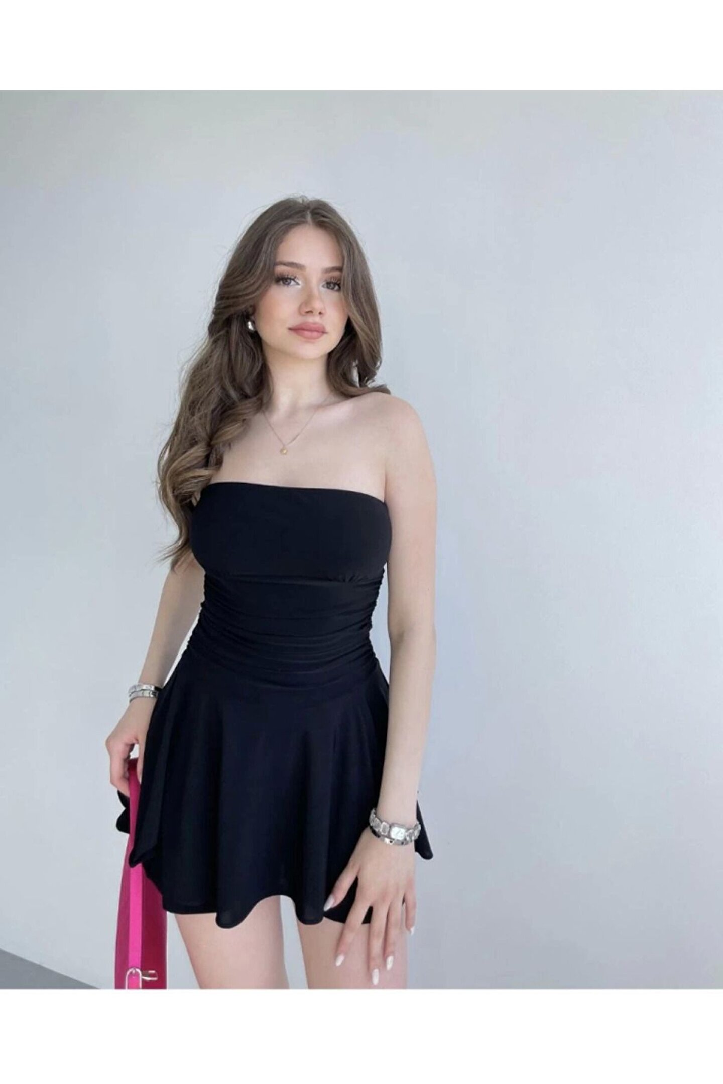 Myterrax Straplez Sandy Kumaş Şortlu Prenses Etek Mini Klos Elbise- Siyah