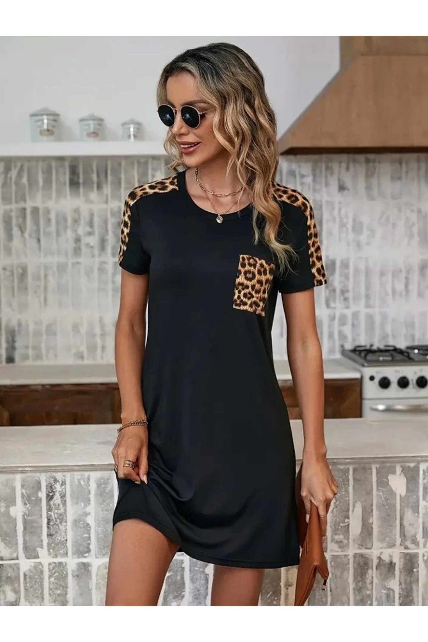 Kadın Kısa Kollu Yuvarlak Yaka Cepli Leopar Desen Detaylı Viskon Elbise