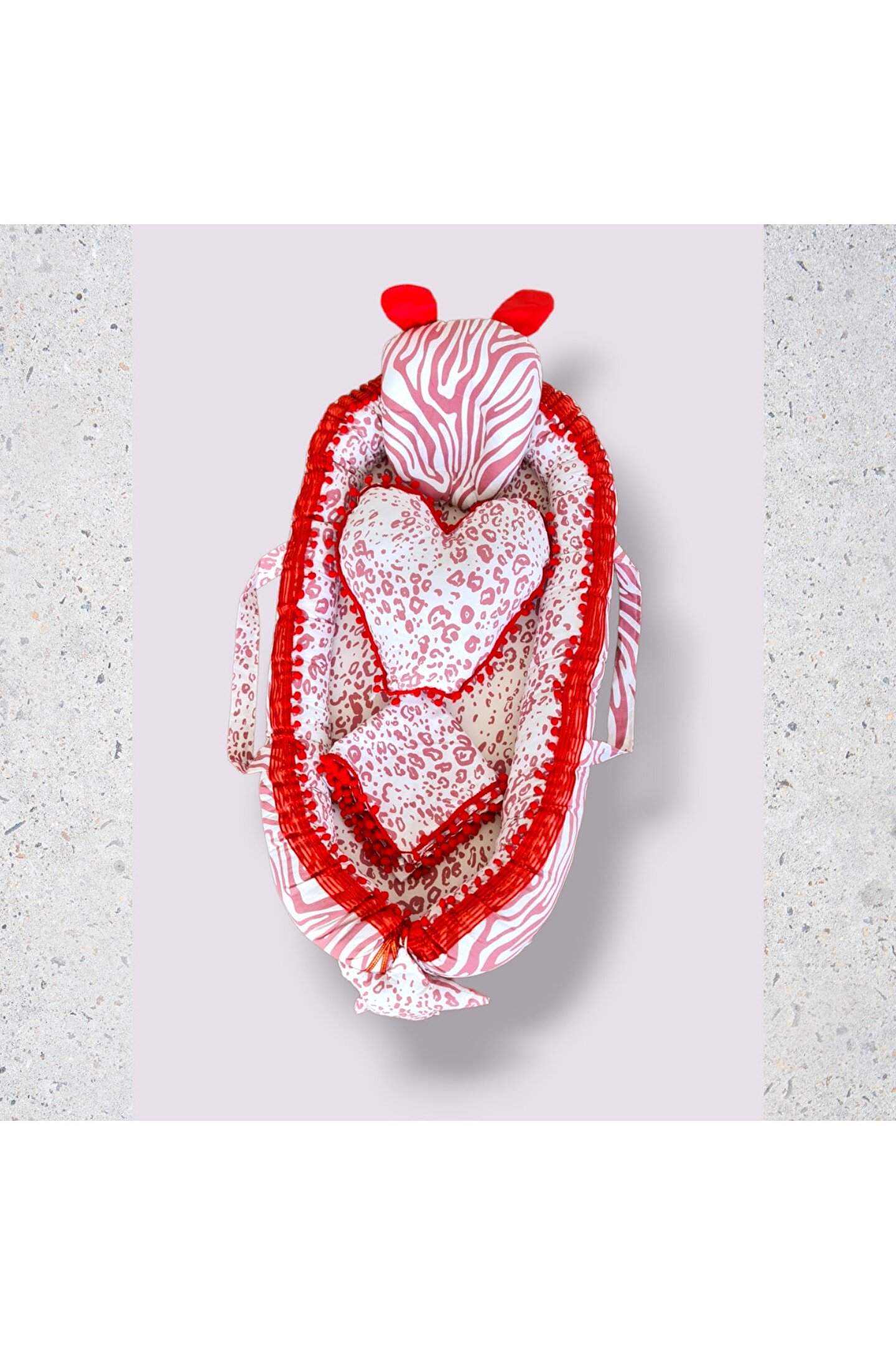 Kırmızı pomponlu Babynest Yatak ve baş yastığı %100 pamuklu kumaştan üretilmiştir, Kenarları ezilmez ve toplanmaz silikonlu 1. ; sınıf boncuk elyafla doldurulmuştur. ; Ortopedik kulaklı yastık düz kafa yastığı Uç kısmında bulunan yıldızlı ipler ile ürün boyu istediğiniz genişlikte ayarlanabilir. ; Bir buçuk yaşına kadar kullanılabilir. ; Dıştan dışa 100x65 cm dir. ; İç ölçüleri 75x35 cm dir. ; Bebeklerinizi, gittiğiniz her yerde rahatlıkla kendi temiz ortamında ki gibi uyutabileceksiniz. ; Pike battaniye 80 x 80 cm % 100 pamuklu kumaştan üretilmiştir terleme ve koku yapmaz, Paket içerisin de babynest, düz kafa yastığı, dekoratif kalp yastık ve pike bulunmaktadır. ; Yerli üretimdir...;