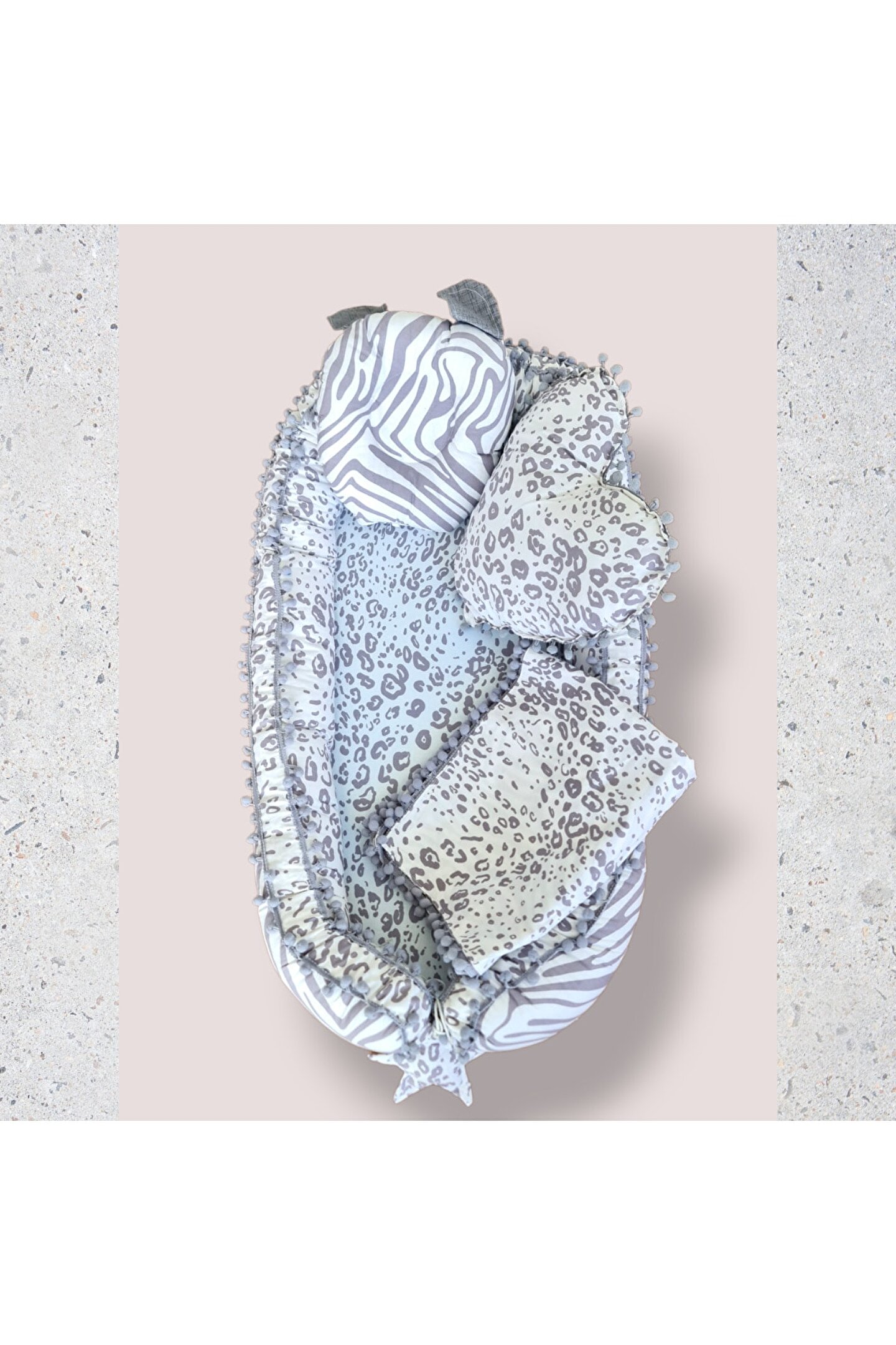 Kırmızı pomponlu Babynest Yatak ve baş yastığı %100 pamuklu kumaştan üretilmiştir, Kenarları ezilmez ve toplanmaz silikonlu 1. ; sınıf boncuk elyafla doldurulmuştur. ; Ortopedik kulaklı yastık düz kafa yastığı Uç kısmında bulunan yıldızlı ipler ile ürün boyu istediğiniz genişlikte ayarlanabilir. ; Bir buçuk yaşına kadar kullanılabilir. ; Dıştan dışa 100x65 cm dir. ; İç ölçüleri 75x35 cm dir. ; Bebeklerinizi, gittiğiniz her yerde rahatlıkla kendi temiz ortamında ki gibi uyutabileceksiniz. ; Pike battaniye 80 x 80 cm % 100 pamuklu kumaştan üretilmiştir terleme ve koku yapmaz, Paket içerisin de babynest, düz kafa yastığı, dekoratif kalp yastık ve pike bulunmaktadır. ; Yerli üretimdir...;