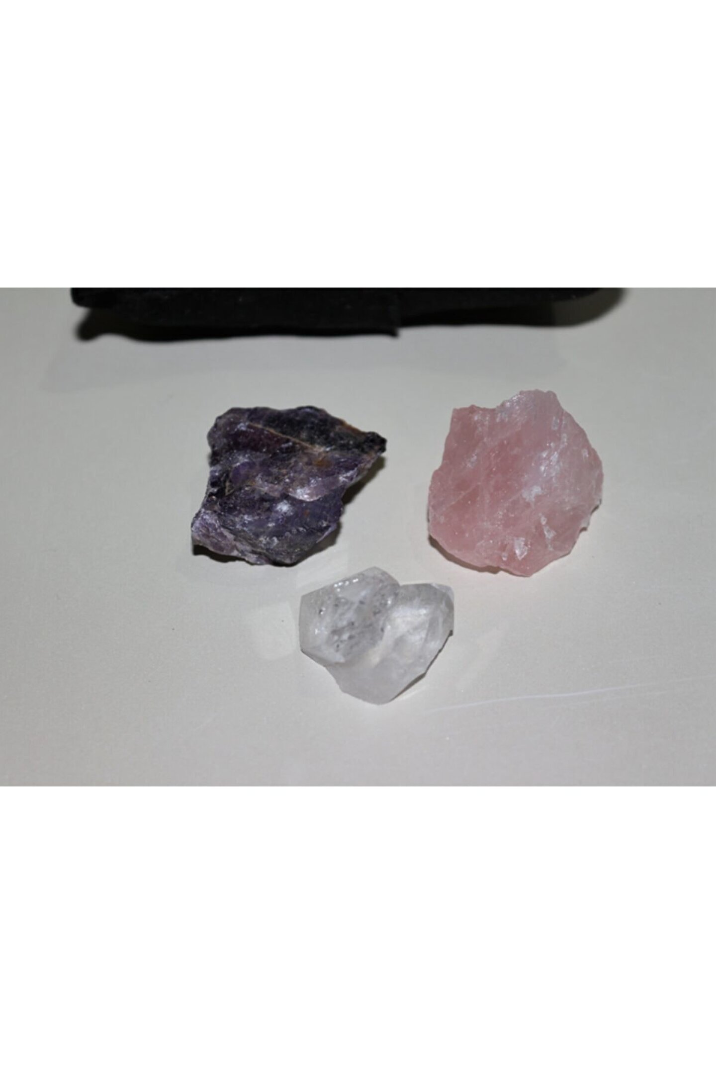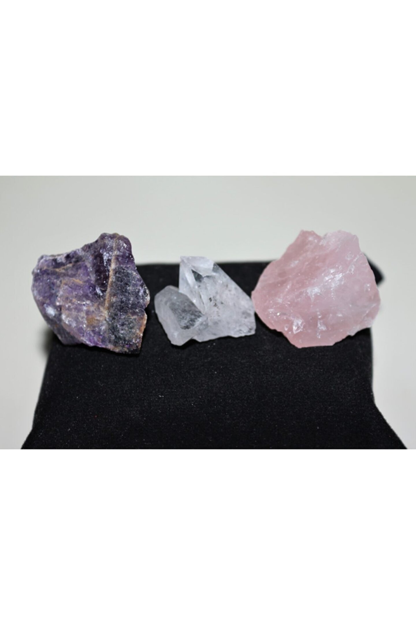 Bu Üründe Kullanılan Doğal Taşlar: İşlenmemiş Pembe Kuvars Taşı, Kristal Kuvars Taşı, Ametist Taşı Bu Üründe Kullanılan Doğal Taş Boyutu: · Ortalama En: 3 cm · Ortalama Boy: 4 cm Doğal Taşların Ortalama Ağırlığı: Ametist Taşı: 20 gr Kristal Kuvars Taşı : 30 gr Pembe Kuvars Taşı :20 gr Not: Ürünler doğal taş olduğu için renk tonları ve şekiller küçük farklılıklar gösterebilir; Bir kese içinde fotoğrafta görünen 3 adet işlenmemiş ham doğal taş size ulaşacaktır, kese rengi ve şekli stok drumuna göre farklılık gösterebilir; ;;