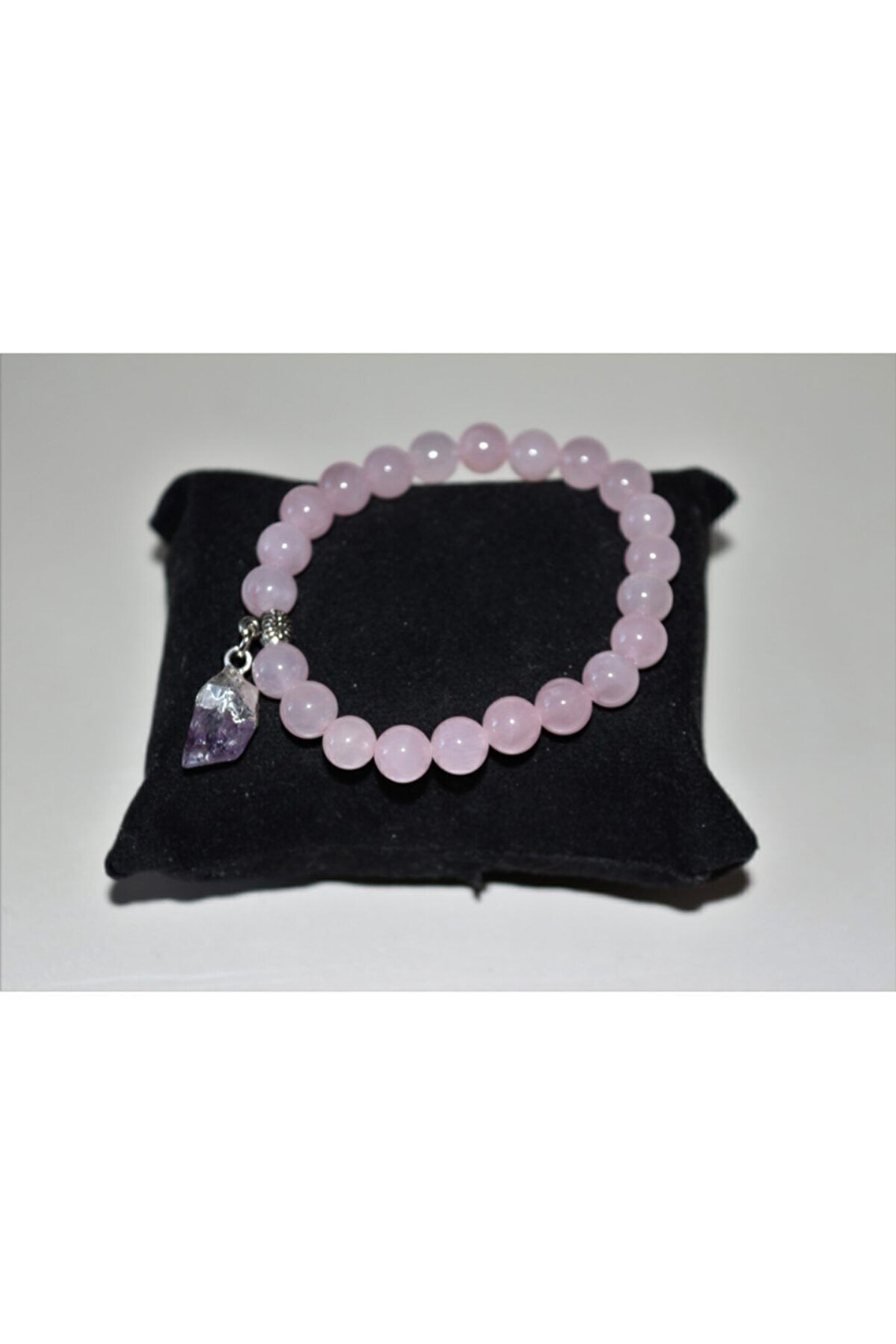 Pembe kuvars taşı, kalbi hastalık ve travmalara karşı korur. Mutluluk duygusu verir. Ametist ile uyumlu kullanıldığı zaman bir şekilde enerjiyi arttırır ve aşk duygusunu güçlendirir. Burçları; Koç, boğa, ikizler, yengeç, başak, Uyumlu olduğu çakra; Boğaz çakrası ve 4. Kalp çakrası; Elastik yapıda olduğu için yetişkin kadın ve erkekler için uygundur, bu üründe kullanılan işlenmemiş ametist taşı şekli küçük farklılıklar gösterebilir Bu üründe kullanılan doğal taş: Pembe kuvars taşı, ametist taşı Bu üründe kullanılan doğal taş boyutu: Ortalama çap : 8 mm; Ortalama uzunluk : 19 cm ( tek sıra );