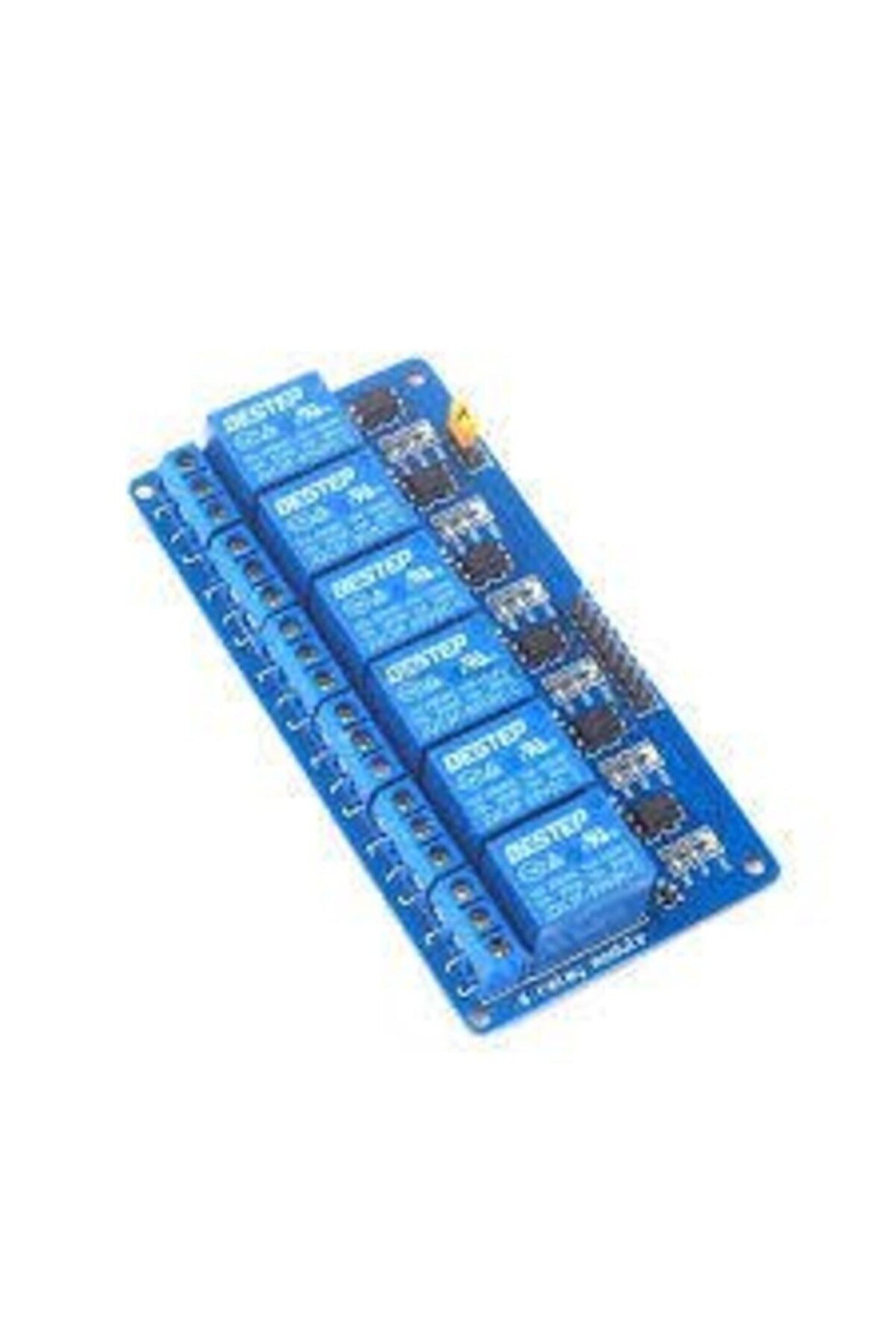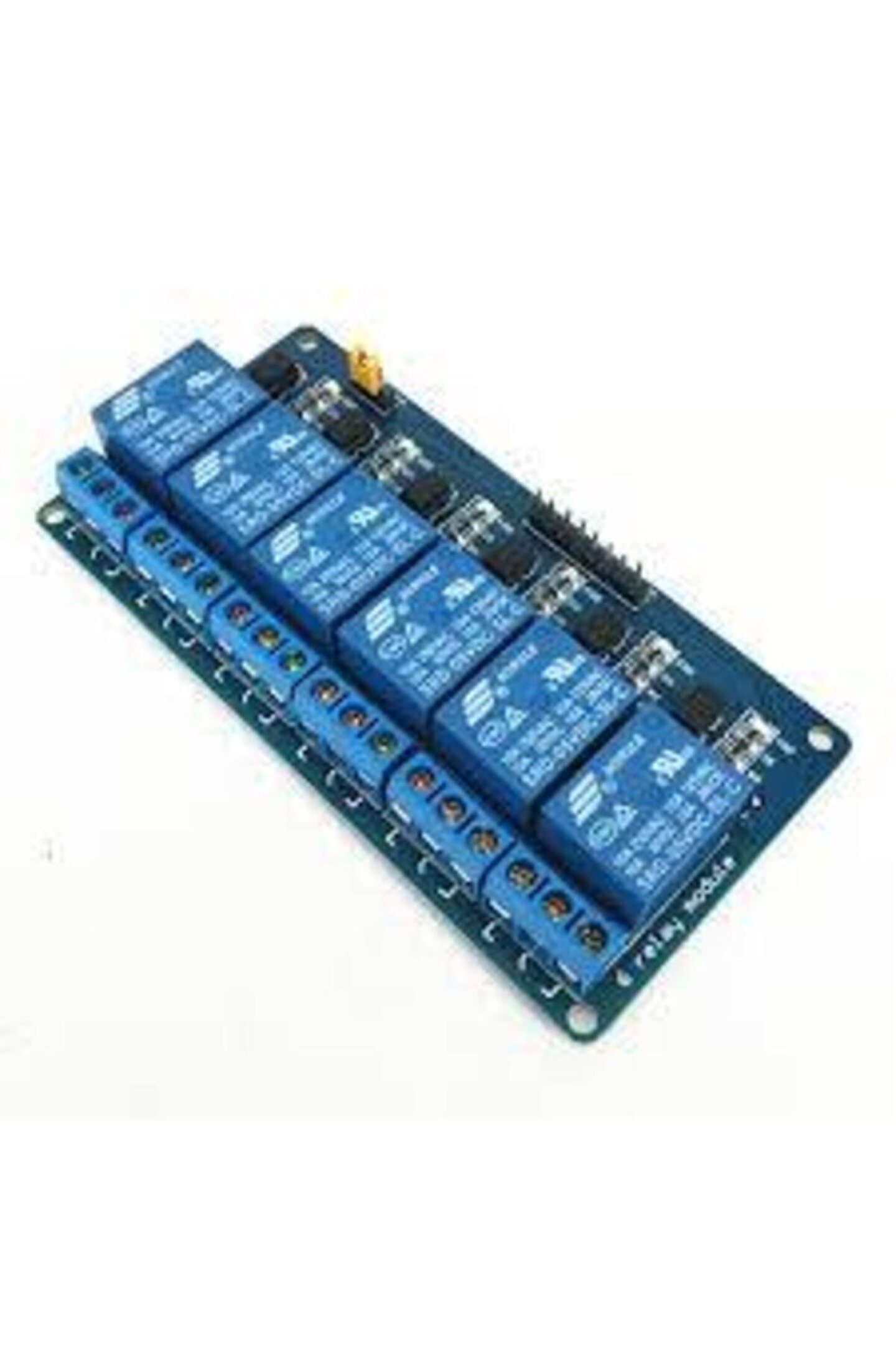 6'lı role kontrol kartı, 5V ile kontakların kontrol edilebildiği, Arduino veya diğer başka mikrodenetleyeciler ile kullanılabilen bir röle kartıdır. ; Mikrodenetleyeciden tetik sinyali sırasında 20mA'lik bir akım çekmektedir. ; Çeşitli hobi, endüstriyel ve robotik projelerde sıklıkla kullanılır. ; 30VDC veya 220VAC gerilimde 10A'e kadar akımı anahtarlayabilmektedir. ; Her bir role için kontrol ledleri bulunmaktadır. ; Röleler lojik 0(0V) ile tetiklenir. ; Röleler için NC,NO ve COM bacakları dışarı alınmıştır. ; Böylece tetikleme durumunda kısa devre veya tetikleme durumunda açık devre olması istenilen durumlarda kullanılabilir. ; Özellikleri: Boyutları: 10,8x5,6x0,2 cm;