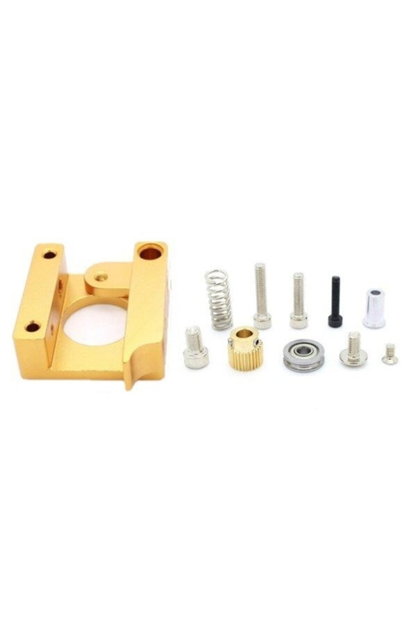 MK8 Alüminyum 1.75mm Extruder Blok Seti - Sağ - Right Right Hand (Sağ EL) MK8 Ekstruder Alüminyum Alaşımlı Blok, 1,75 mm filamentin kolay yüklenmesi ve boşaltılması sağlar. ; Alüminyum alaşımından mamuldür, mükemmel korozyon direncine sahiptir ve ürünlerin servis ömrünü uzatır. ; Sol, Sağ ve Sağ Kısa versiyonları vardır. ; Kurulum Motordaki alüminyum yatağı motor miline 26 diş besleme dişlisi ile sabitleyin, üst tel ile sabitleyin ve ardından tabandaki vidaları kullanarak motora sabitleyin. ; Yatağı vidalarla sabitleyin, beyaz bakır manşonu alüminyum blok deliğine yerleştirin ve motoru siyah vidalarla sabitleyin. ; İlk önce sağ el vidasını gevşetin ve yaya yerleştirin.;