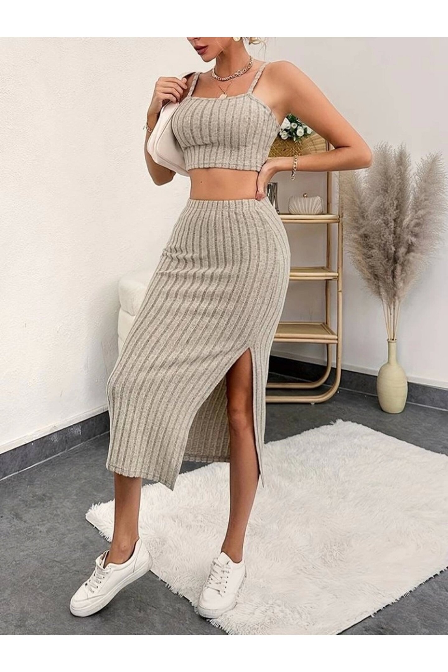 Kadın Kolsuz Askılı Crop Yırtmaçlı Midi Etek Fitilli Kaşkorse Takım