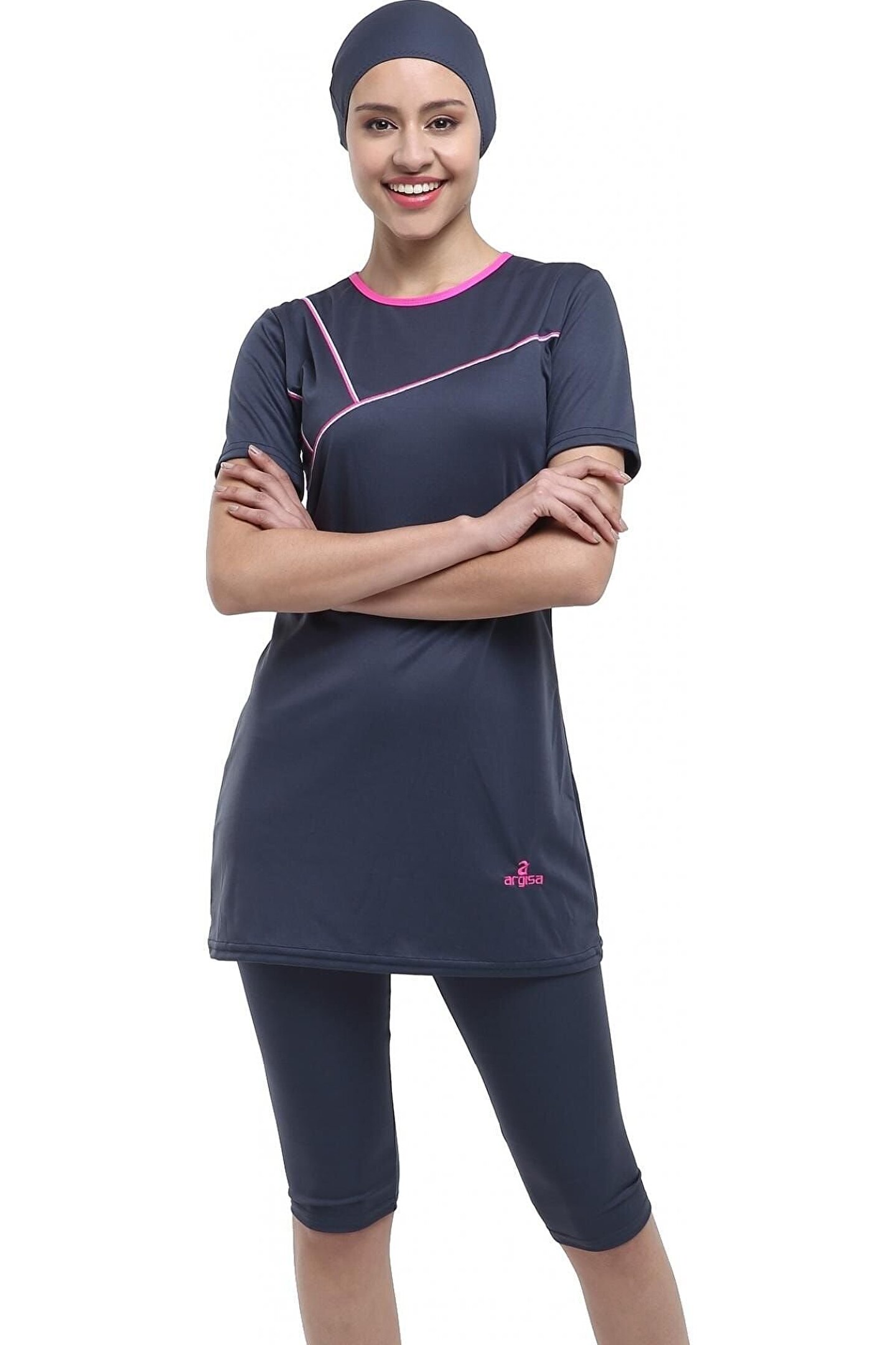Kadın Antrasit Nakışlı Yarım Kol Jumbo Tesettür Mayo
