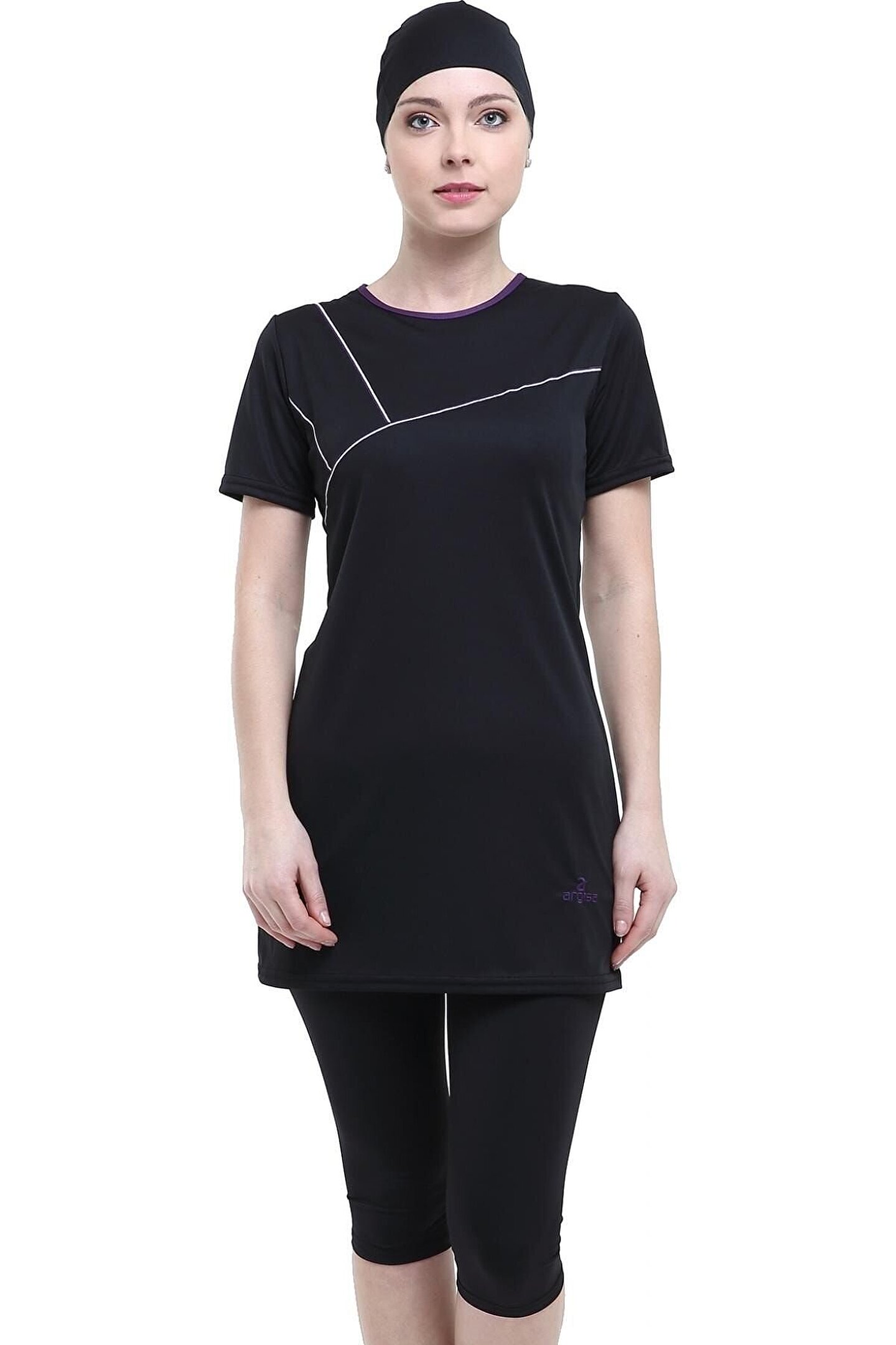 Kadın Siyah Nakışlı Yarım Kol Battal Tesettür Mayo