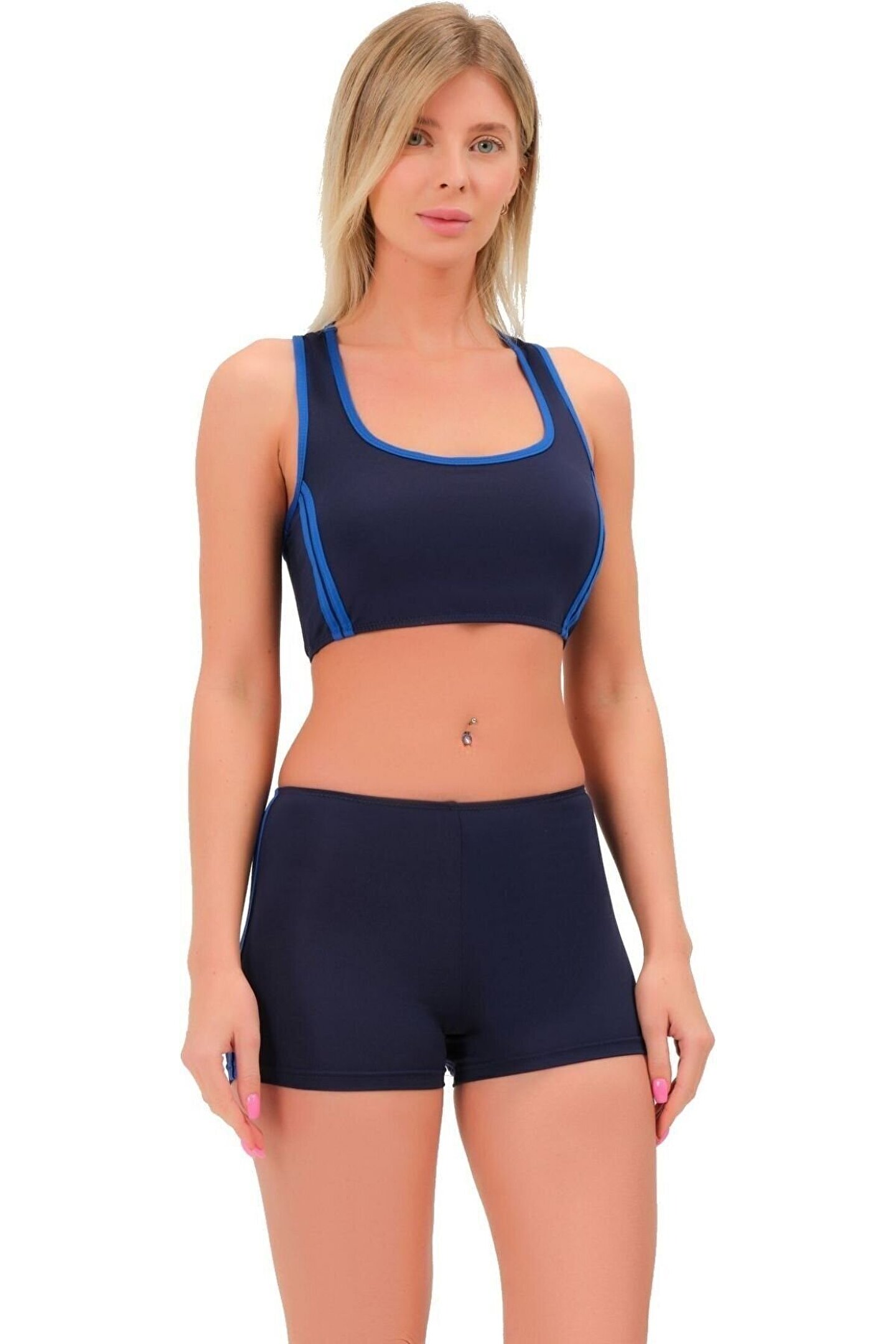Şeritli Şortlu Yüzücü Bikini 5509 Lacivert