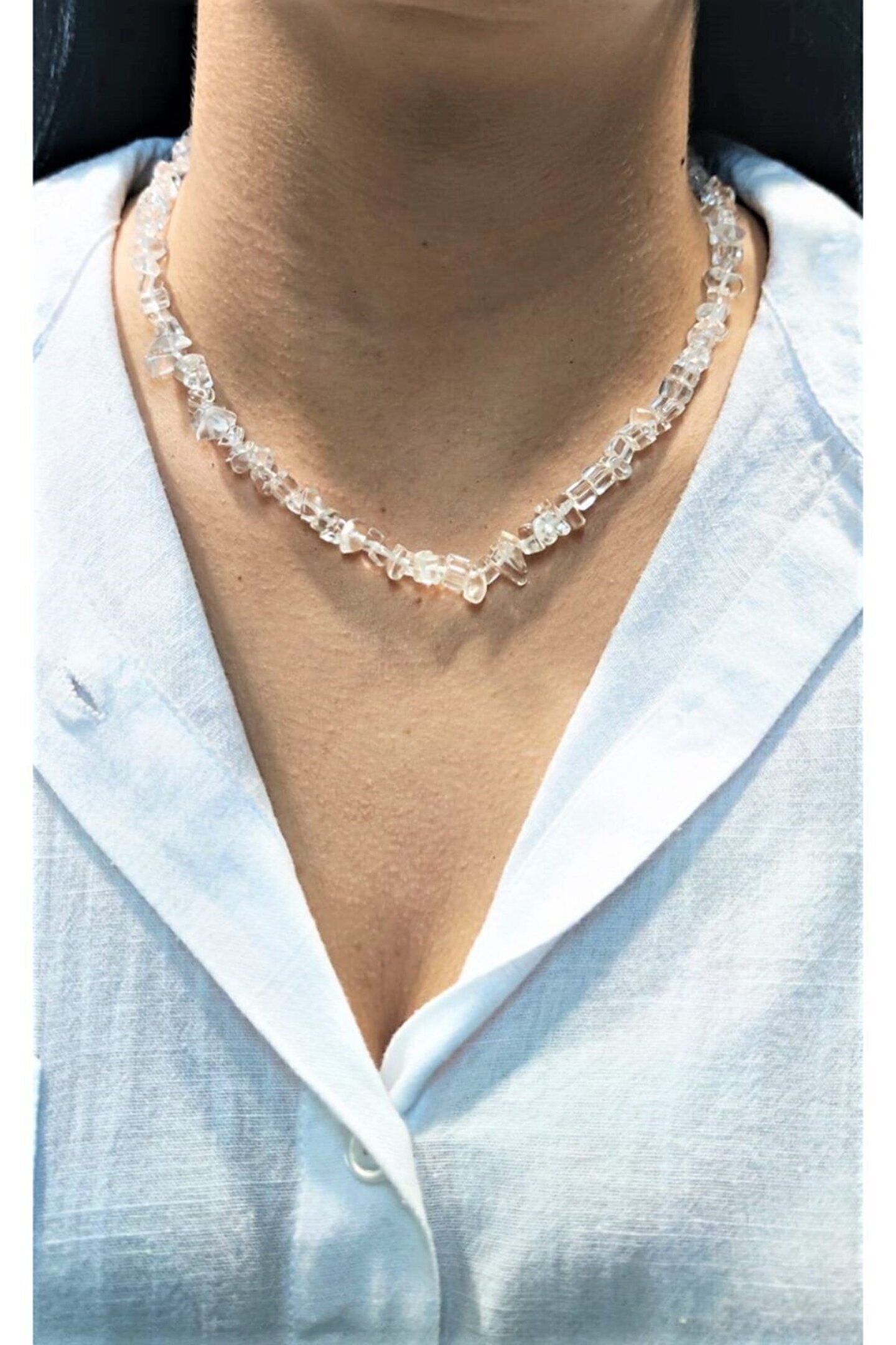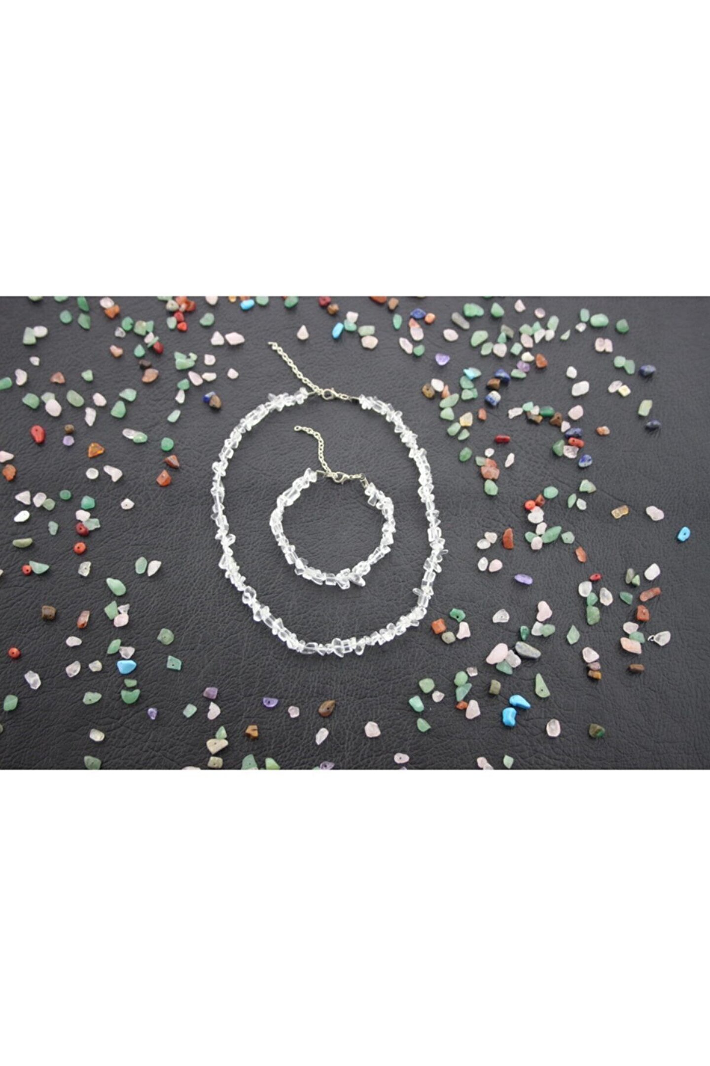 Doğal taş kullanımı sayesinde her parça benzersiz ve özgün bir görünüm sunar; Kristal kuvars taşı, şıklığı ve zarafeti ile dikkat çekerken, aynı zamanda enerji veren özellikleri ile de ön plana çıkar; Kolye ve bileklik seti, kırıktaş tasarımıyla modern ve trend bir stil oluşturur; Taşın doğal yapısı, her kullanımda farklı bir parlaklık ve renk tonu sergiler, bu da onu her kıyafetle uyum sağlayacak çok yönlü bir aksesuar haline getirir;