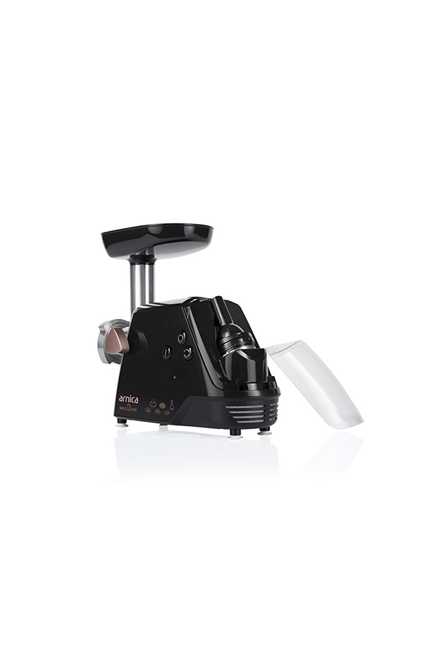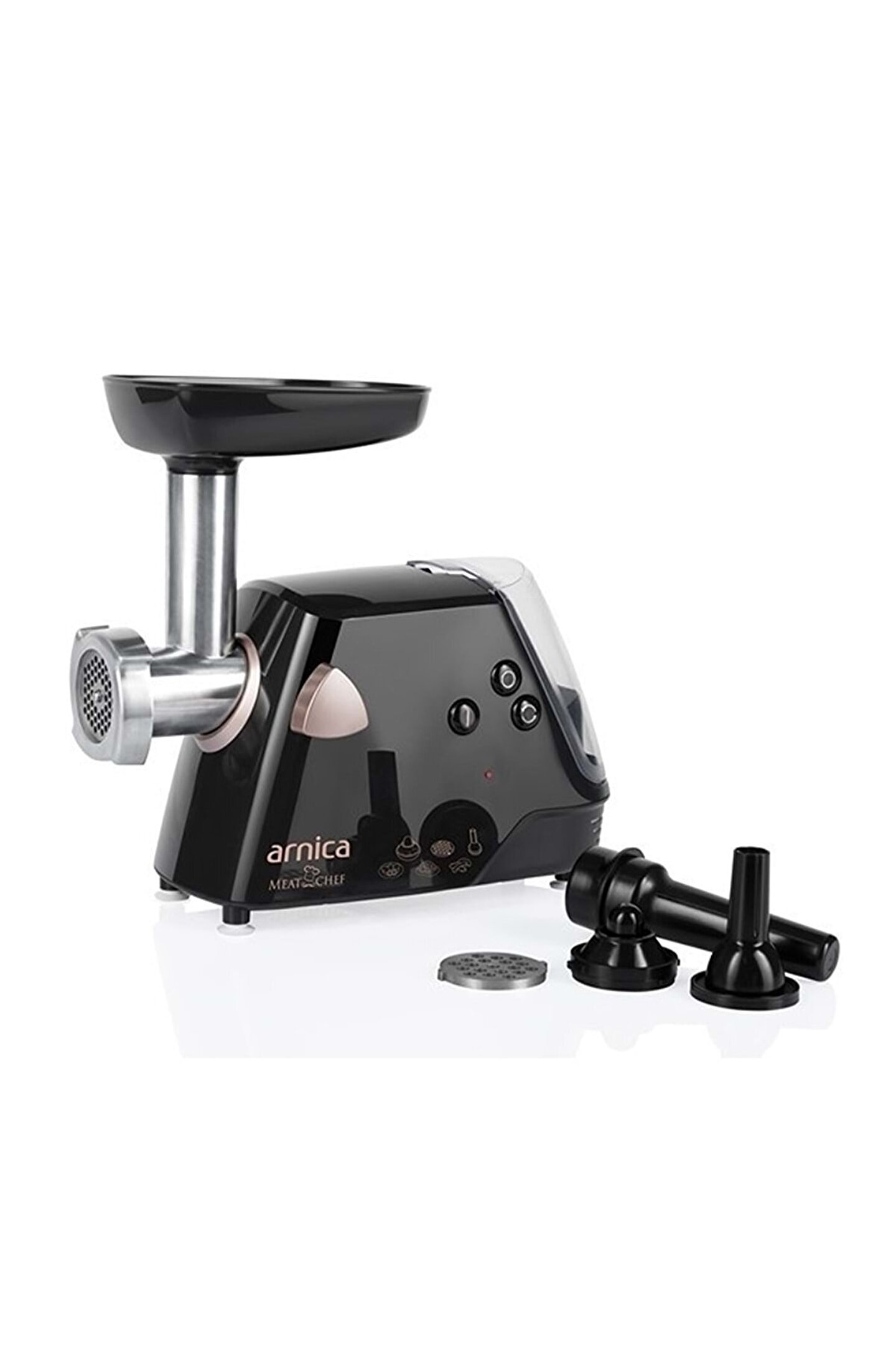Teknik Özellikler 700 W motor gücü; Açma kapama, tuşu; Reset Tuşu; Çelik Dişler; Motor Koruma Şalteri; Paslanmaz çelik kıyıcı silindir; Kıyma diski; Kıyma yapabilme; Salça Yapabilme; İçli köfte aparatı; Sosis sucuk hunisi; Aksesuar bölümü; Kablo yuvası; ; Arnica Meat Chef Et Kıyma Makinesi Şık görünümün pratik kullanımla birleştiği Arnica Meat Chef Et Kıyma Makinesi; sizleri birer usta şef yapmayı amaçlıyor.; Önlükleriniz hazırsa başlayalım.; Et kıyma makinesi ile kıymanızı çekebilir, köftelerinizi hazırlayabilir ve misafirlerinizi şaşırtabilirsiniz.; Sosis sucuk hunisi ile evinizde güvenli ve lezzetli sosisler ve sucuklar hazırlayabilir çocuklarınızı şımartabilirsiniz.; Bütün bu özelliklere ek olarak harika salçalar yapabilir ve bütün bir kış mevsiminde güvenle tüketebileceğiniz salçalarınız ile yemeklerinize lezzet katabilirsiniz.; Ergonomik kullanımının yanı sıra Meat Chef Et Kıyma Makinesi sahip olduğu aksesuar bölümü ile makine aparatlarının dağınık bir şekilde durmasını engellerken kablo yuvası dağınık kablo görüntüsünü ortadan kaldırmaktadır.; 1400 W motor gücüne sahip olan bu muazzam makine "motor koruma şalteri" ile güvenli bir kullanım sağlarken barındırdığı paslanmaz çelik kıyıcı silindir ve çelik dişler sayesinde sağlıklı bir kullanım sunar.; Lezzetli ve güvenli ürünler üretmenizi sağlayacak kıyma makinesine şimdi sahip olabilirsiniz.