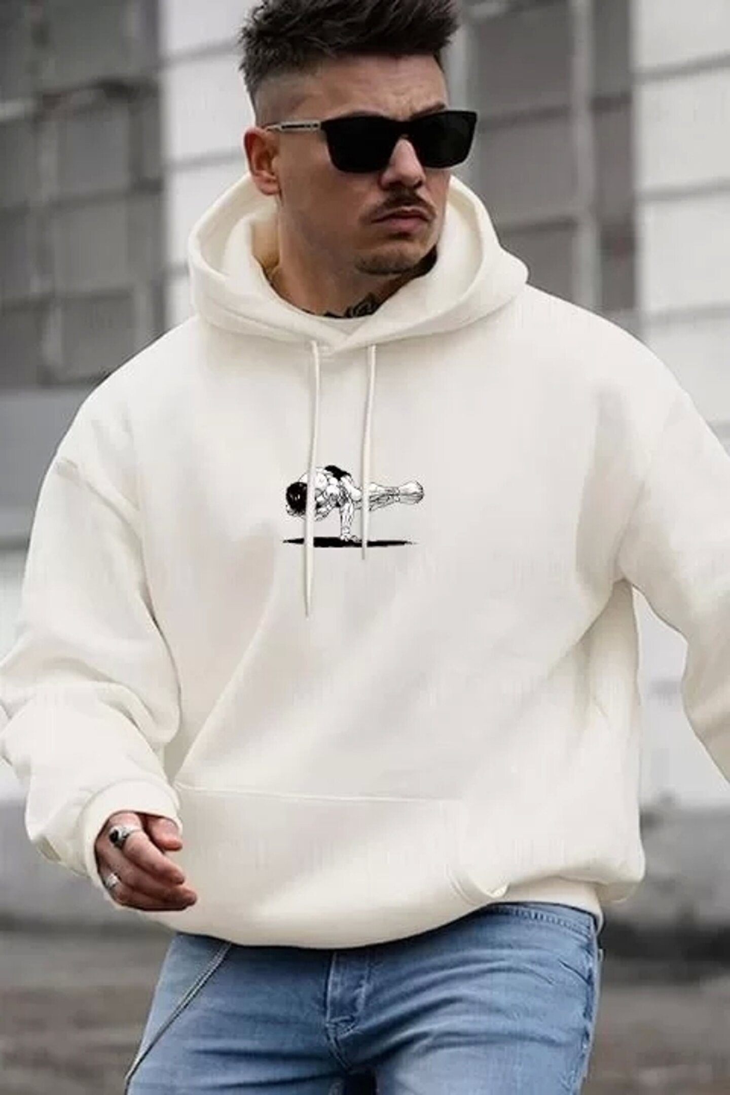 ARONA Erkek Baskılı Kapüşonlu ve Kordon İpli Sweat - Beyaz