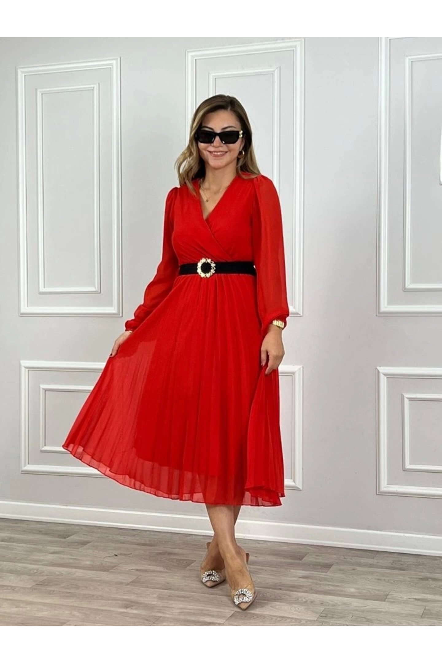 Kadın şifon Kumaş Astalı Kloş Kesim Kruvaze Yaka Midi Boy Elbise