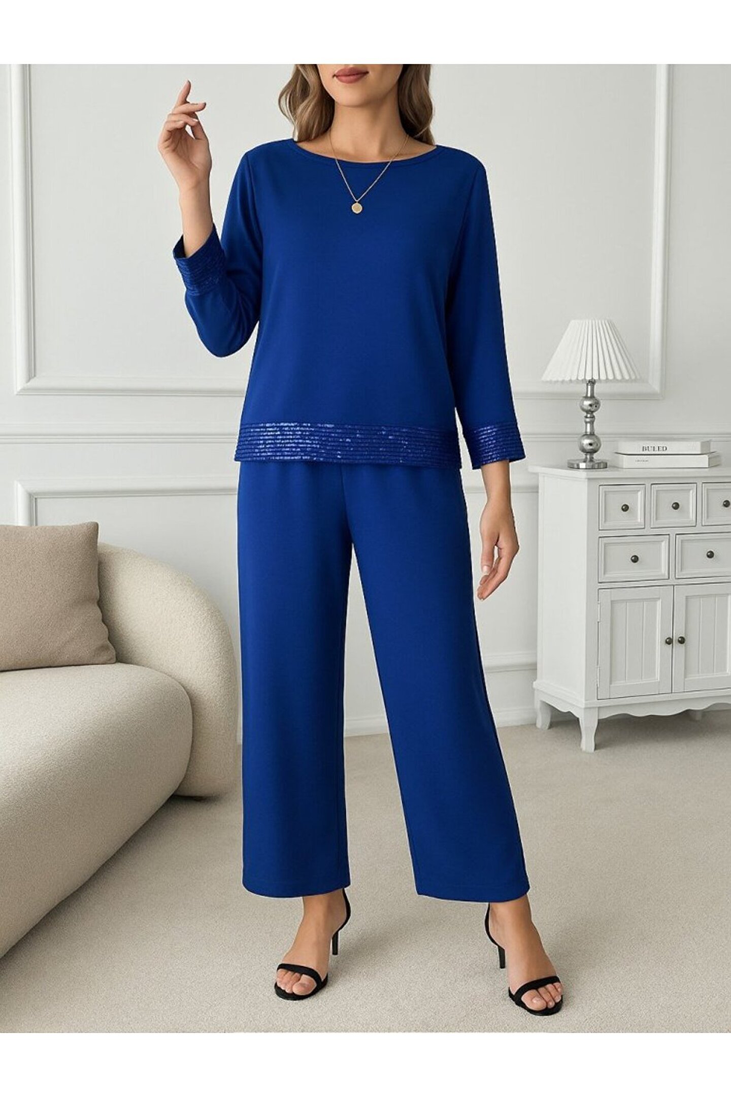 Kadın Uzun Kollu Bisiklet Yaka Pulpayetli Viskon Iki Iplik Bluz Ve Pantolon Ikili Takım