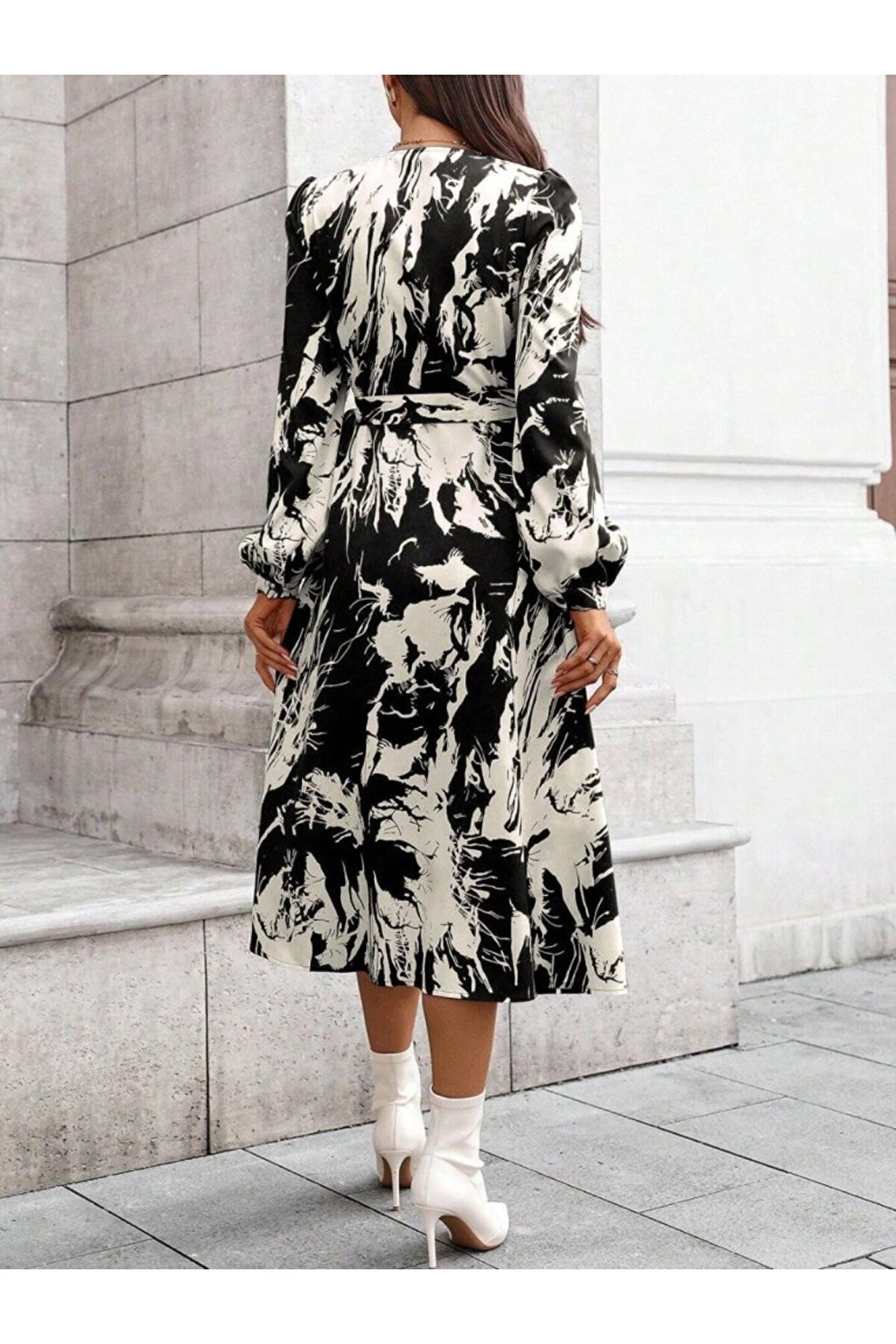 ARONA Kadın Uzun Kollu Kruvaze Yakalı Yandan Bağlamalı Desenli Mini Modal Elbise