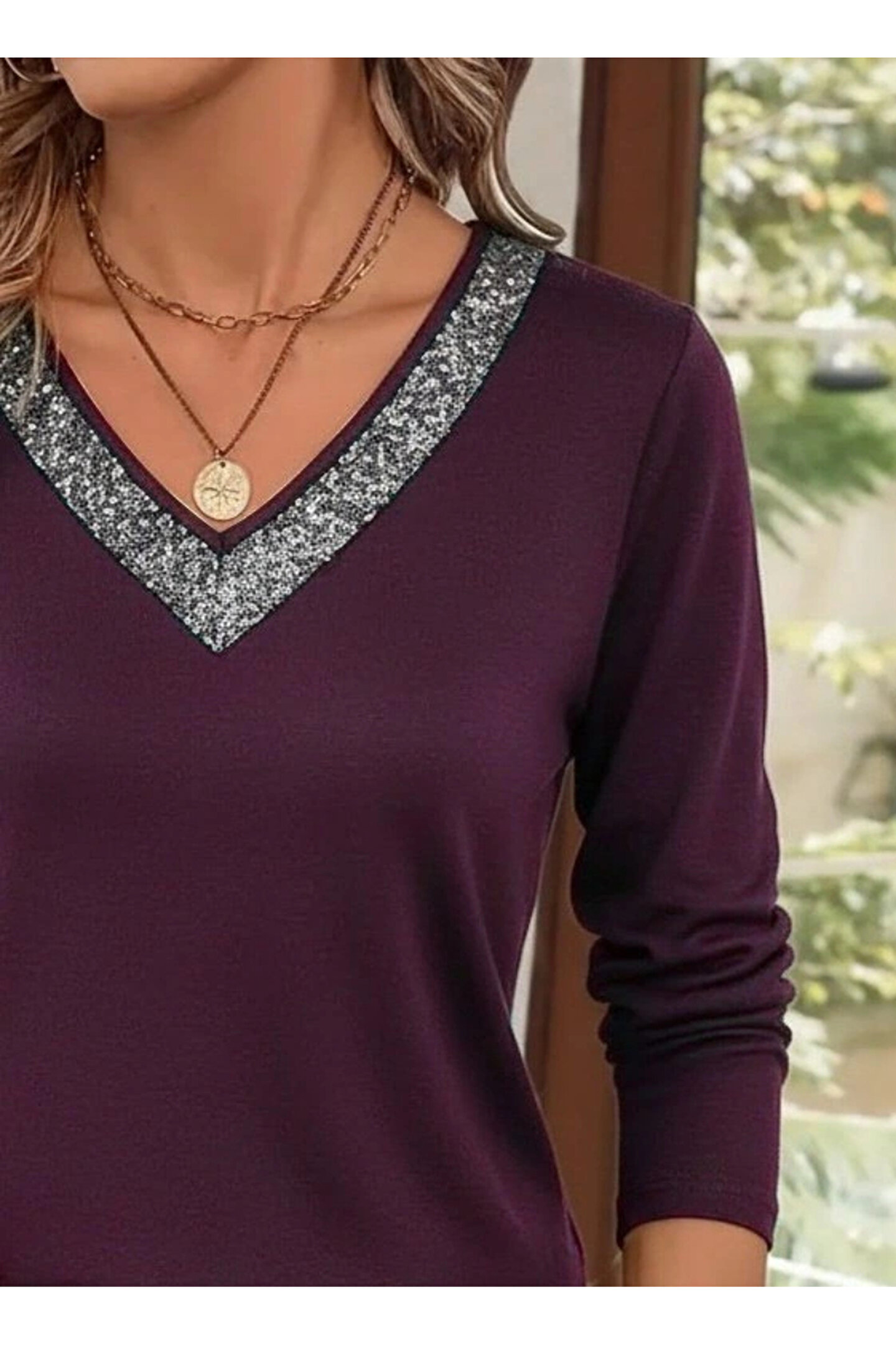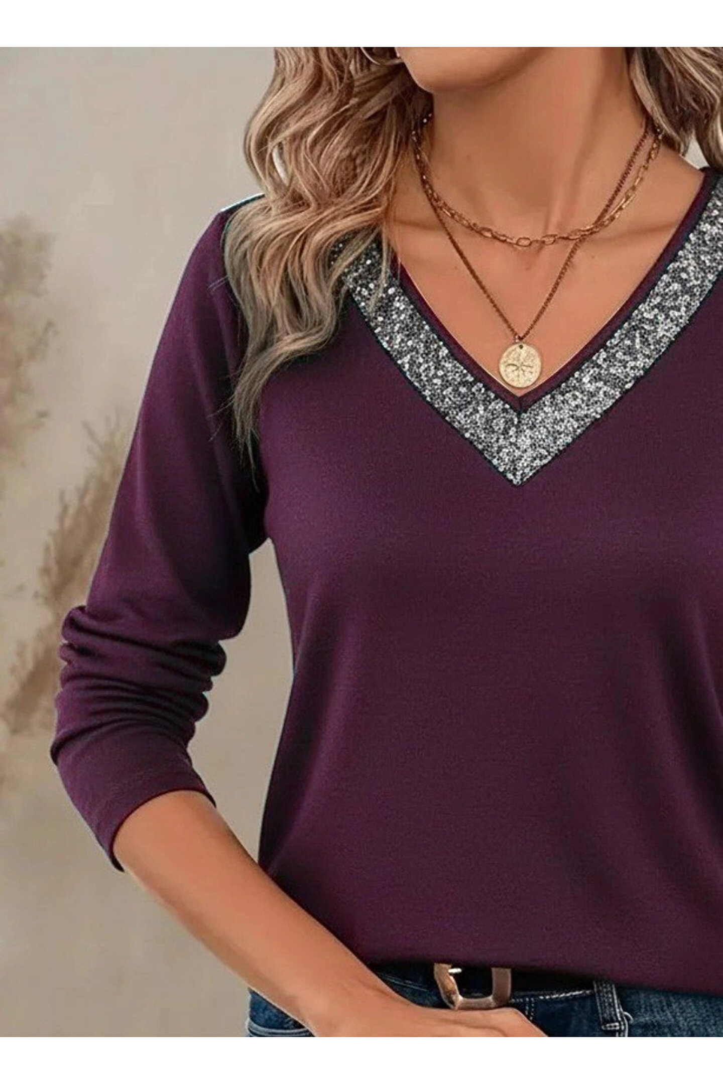 Kadın Uzun Kollu V Payet Yakalı Viskon Mürdüm Bluz