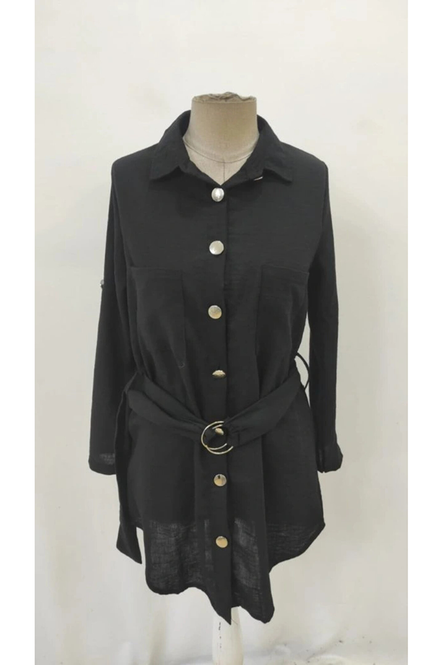 Kadın Uzun Kollu Yakalı önden Düğmeli Beli Kuşaklı Mini Ithal Keten Elbise