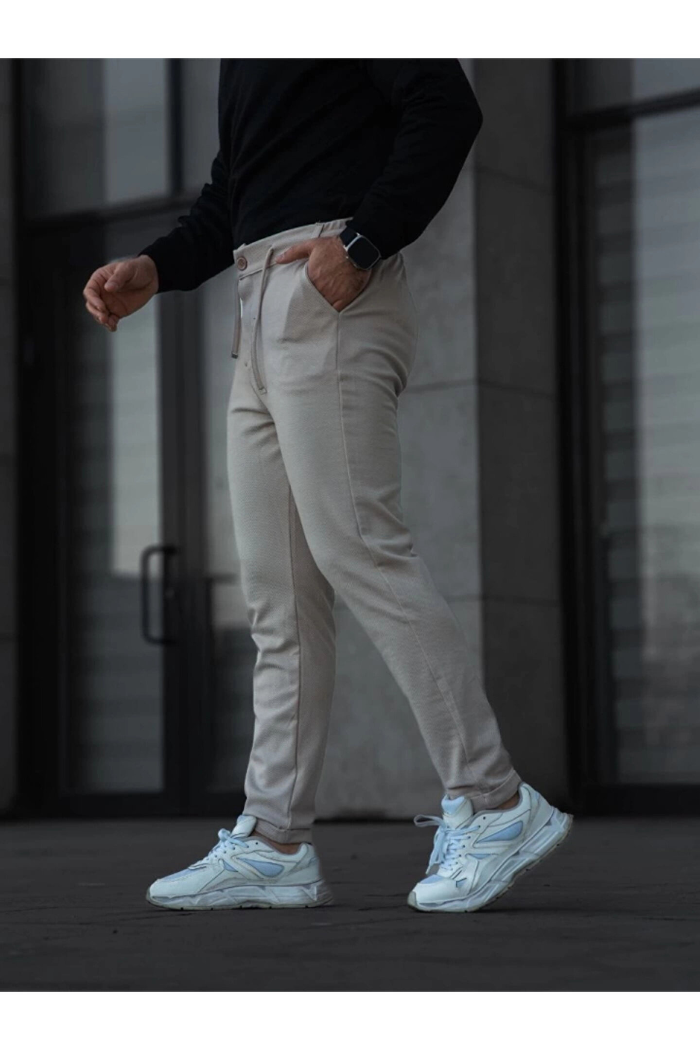 Erkek Diagonel Mikro Dokulu Cepli Pantolon - Bej