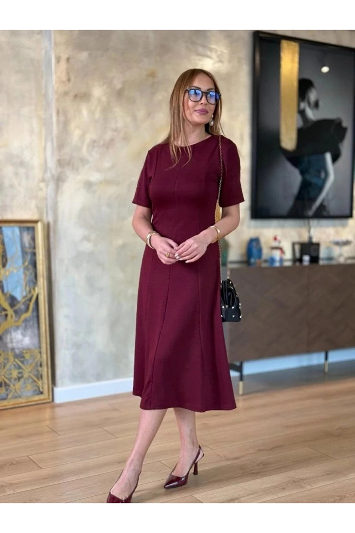 Kadın Kısa Kollu Bisiklet Yaka Midi Viskon Iki Iplik Elbise