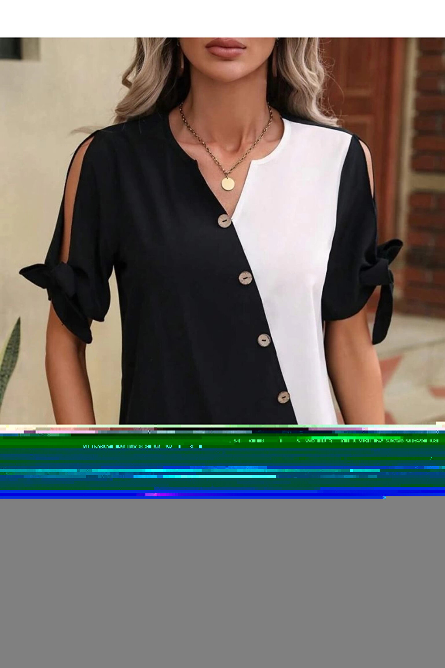 Kadın Kısa Kollu Kollardan Bağlamalı önden Asimetrik Kesim çift Renk Detaylı Düğmeli Ithal Krep Bluz