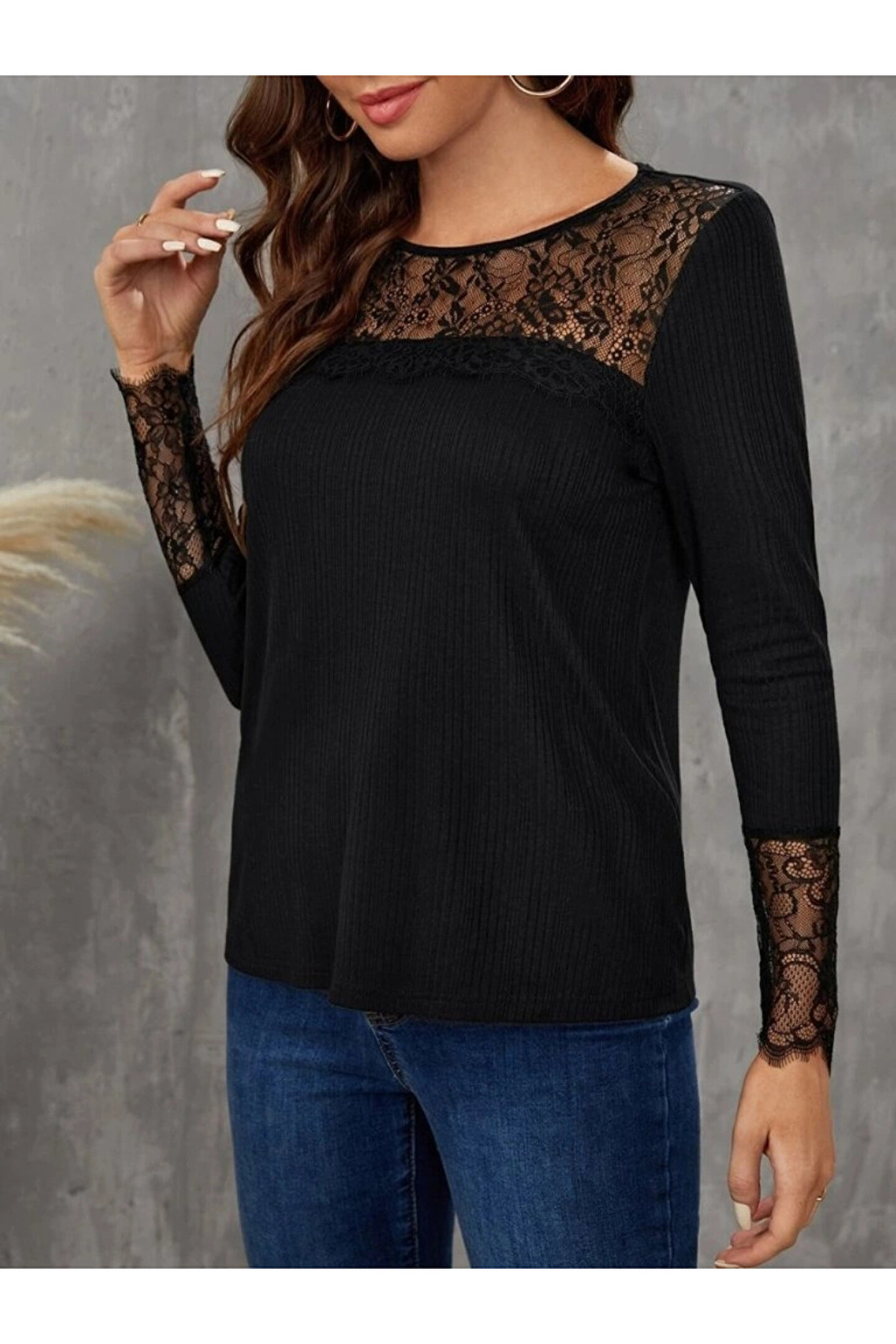Kadın Uzun Kollu Bisiklet Yaka Dantel Detaylı Burgu Bluz