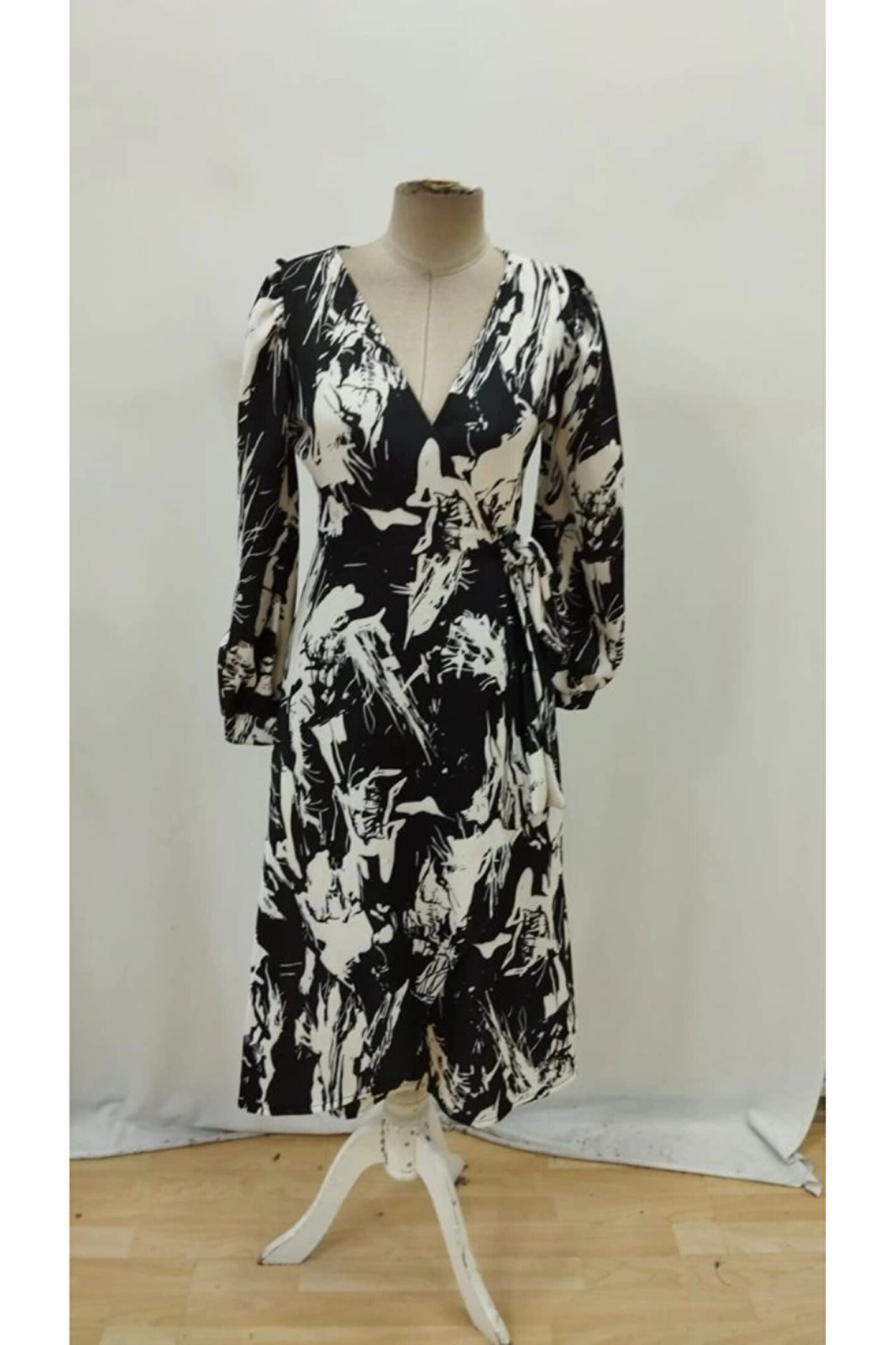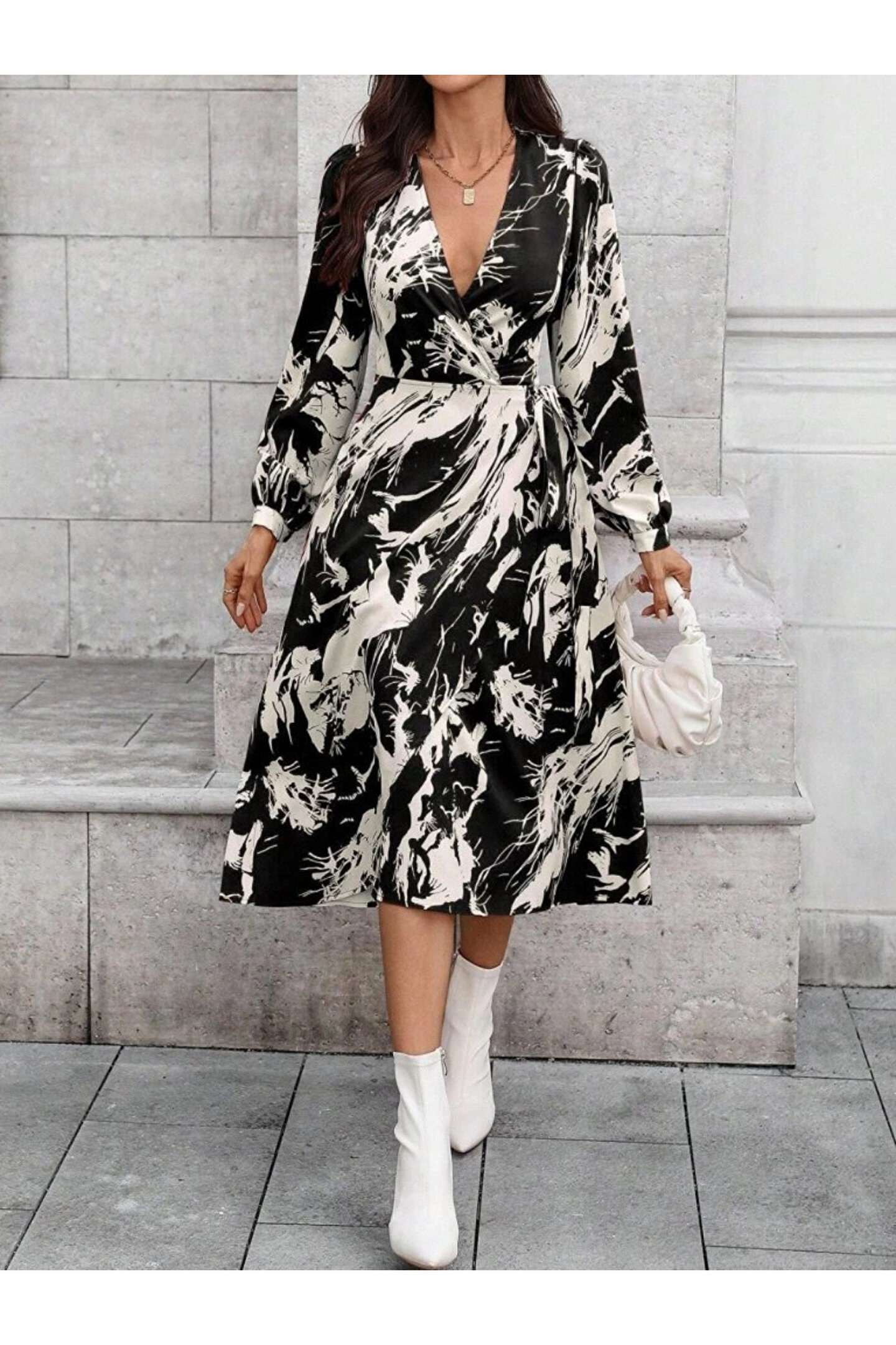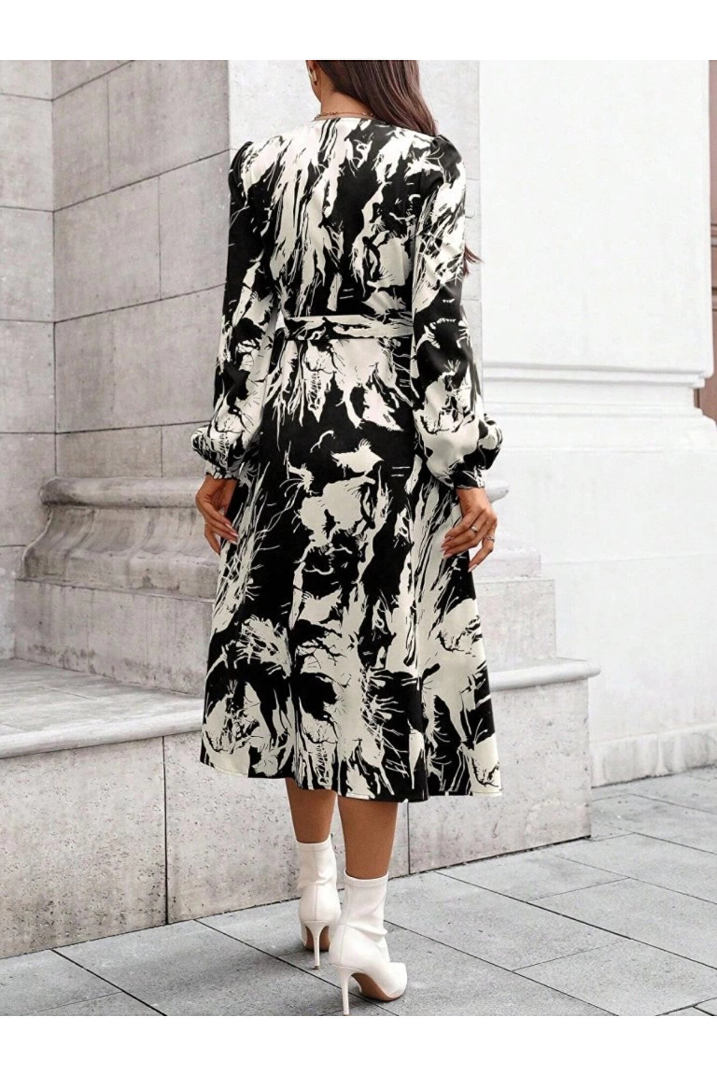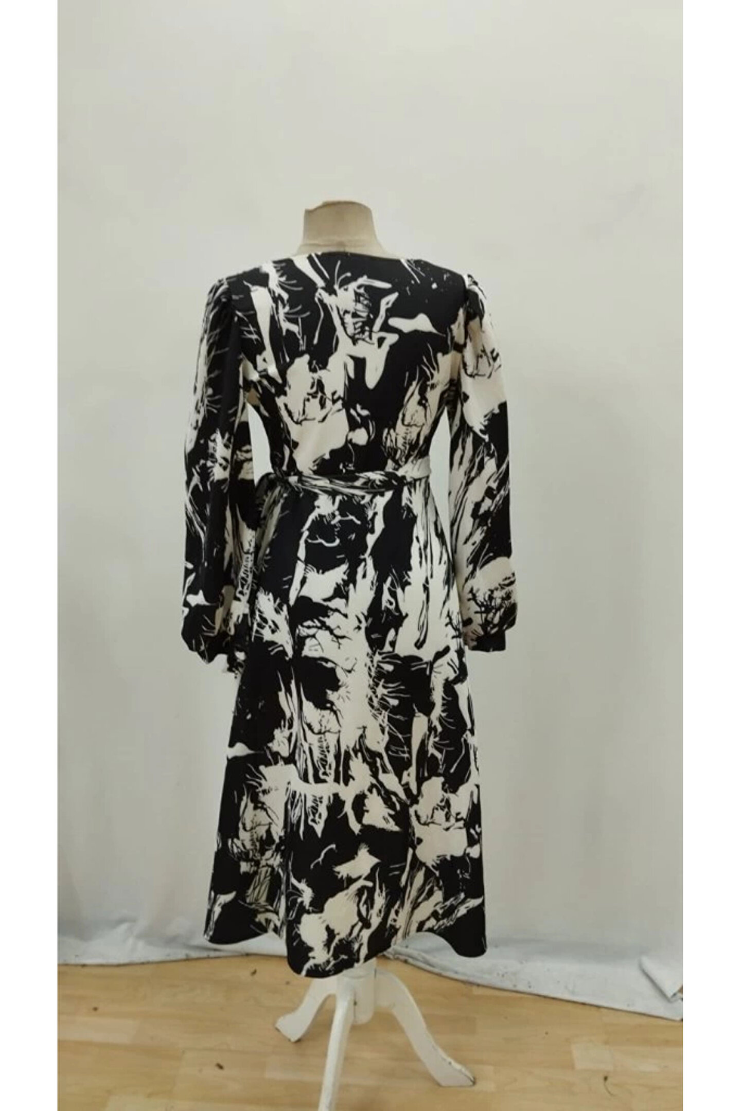 ARONA MDB Kadın Uzun Kollu Kruvaze Yakalı Yandan Bağlamalı Desenli Mini Modal Elbise