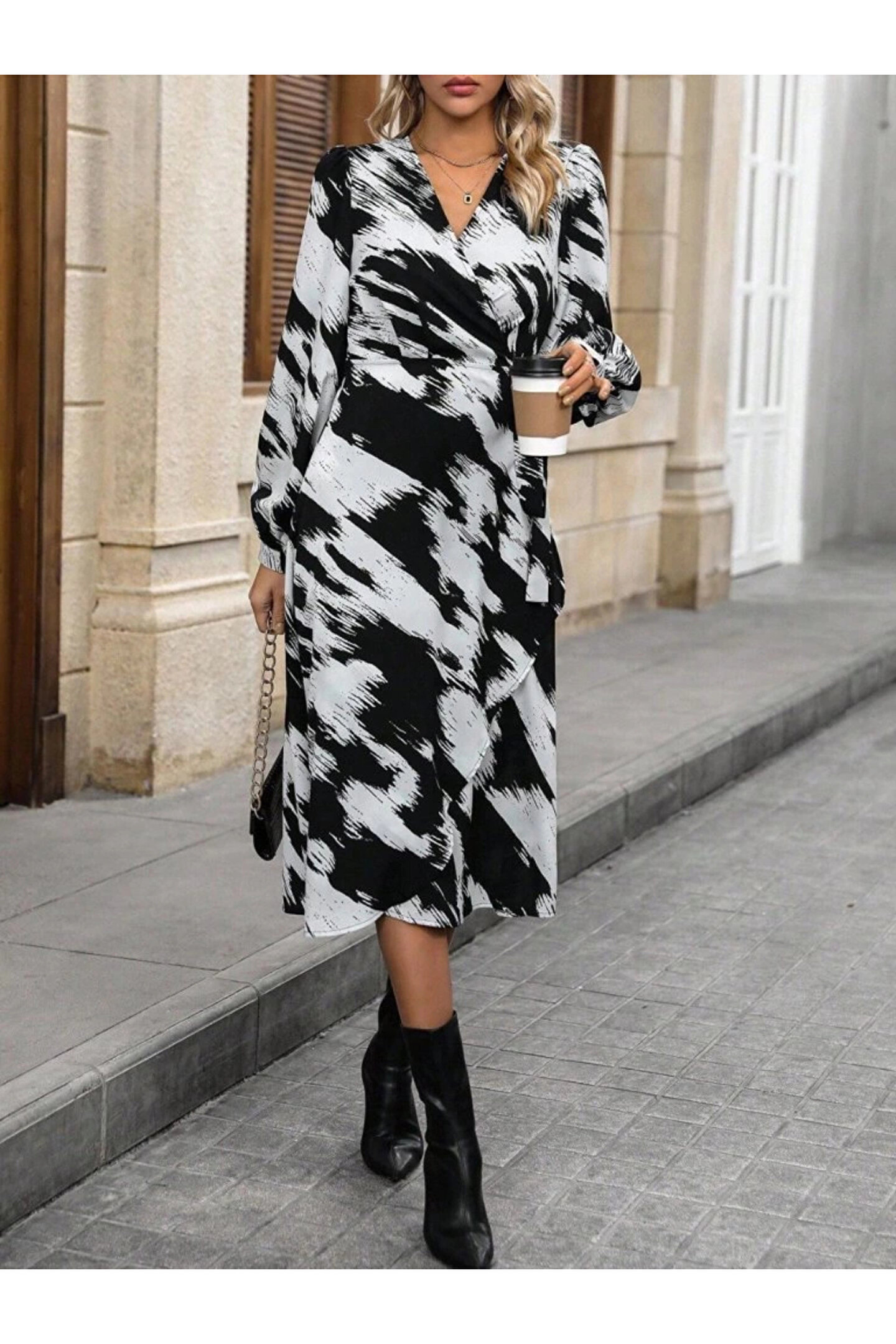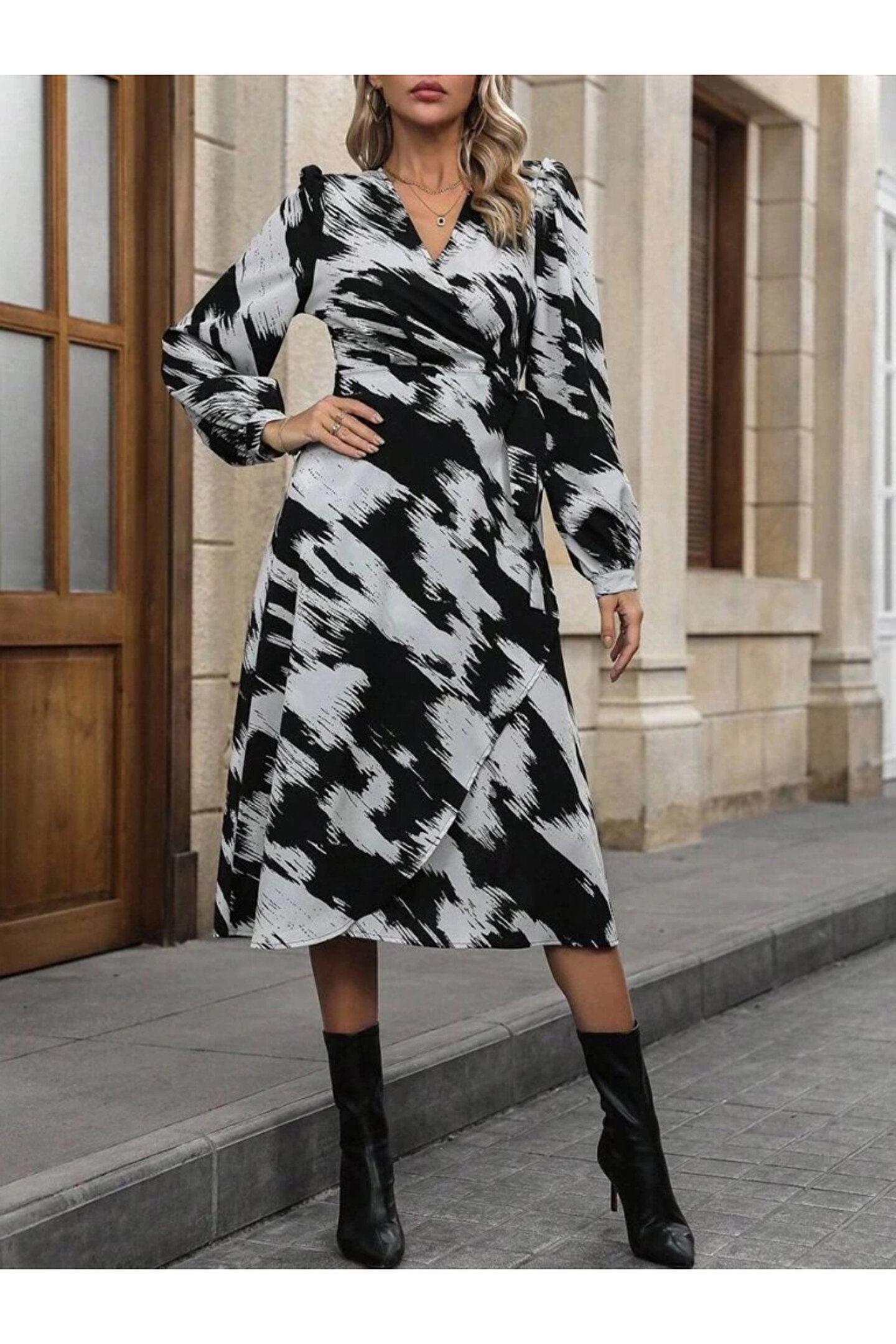 ARONA MDB Kadın Uzun Kollu Kruvaze Yakalı Yandan Bağlamalı Desenli Mini Modal Elbise