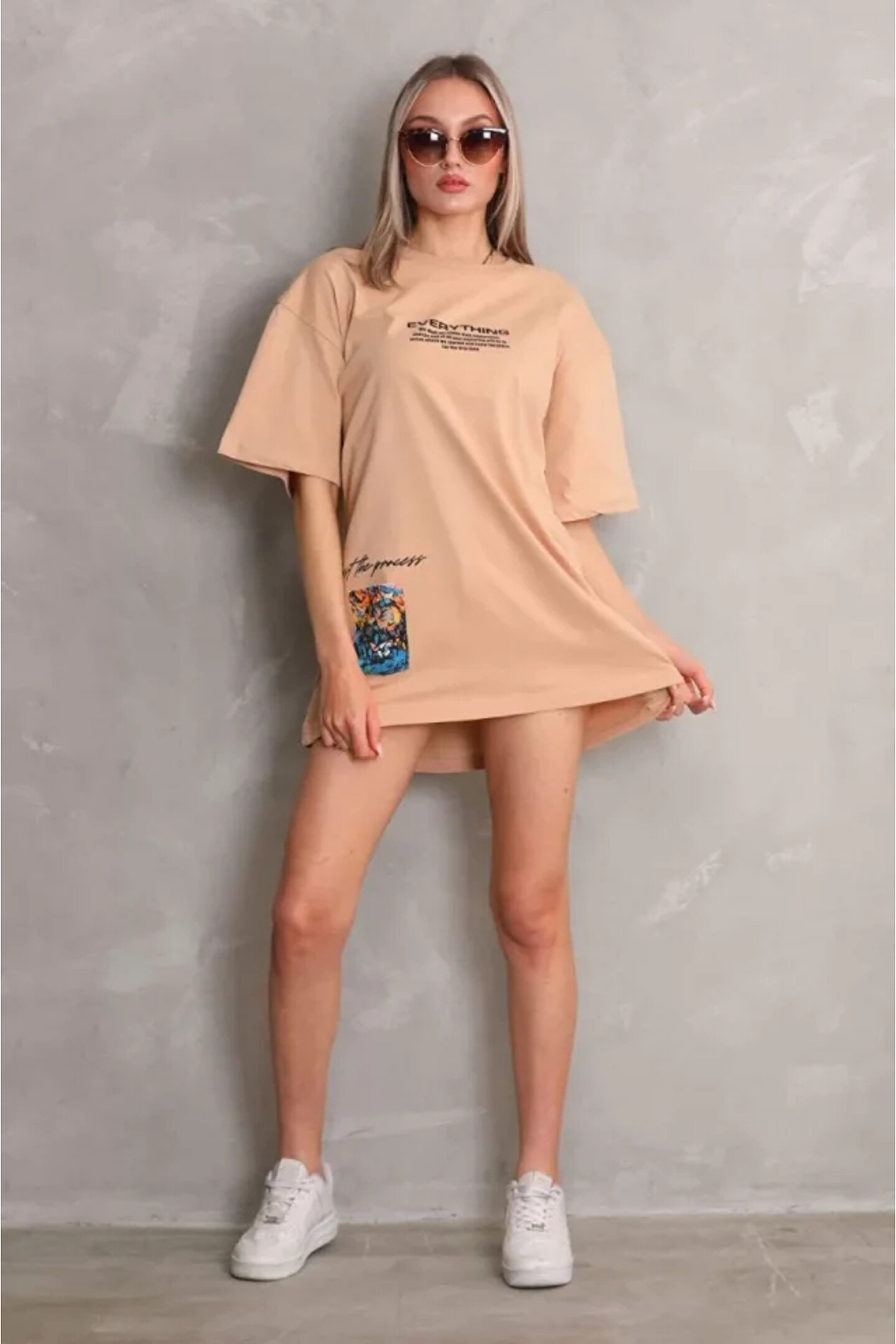 Unisex Bisiklet Yaka Baskılı Oversize T-Shirt - Bej Modelin Ölçüleri: Boy:165, Kg:55, Göğüs:90, Bel:72, Kalça: 100 Modelin üzerindeki ürün M/38 bedendir