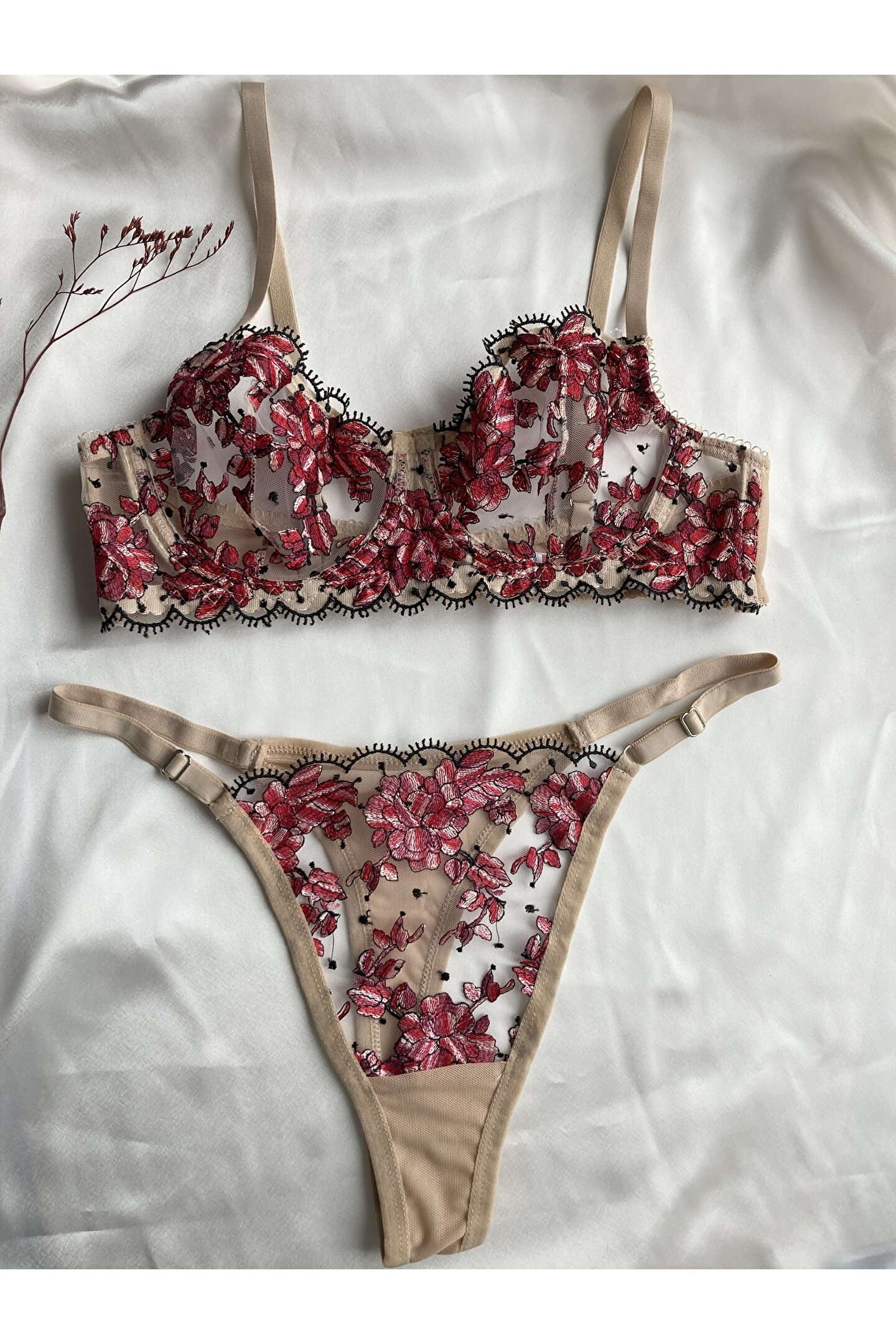 Pembe Çiçek Desenli Brode İşlemeli Balenli Ten Rengi Sütyen Tanga Takım