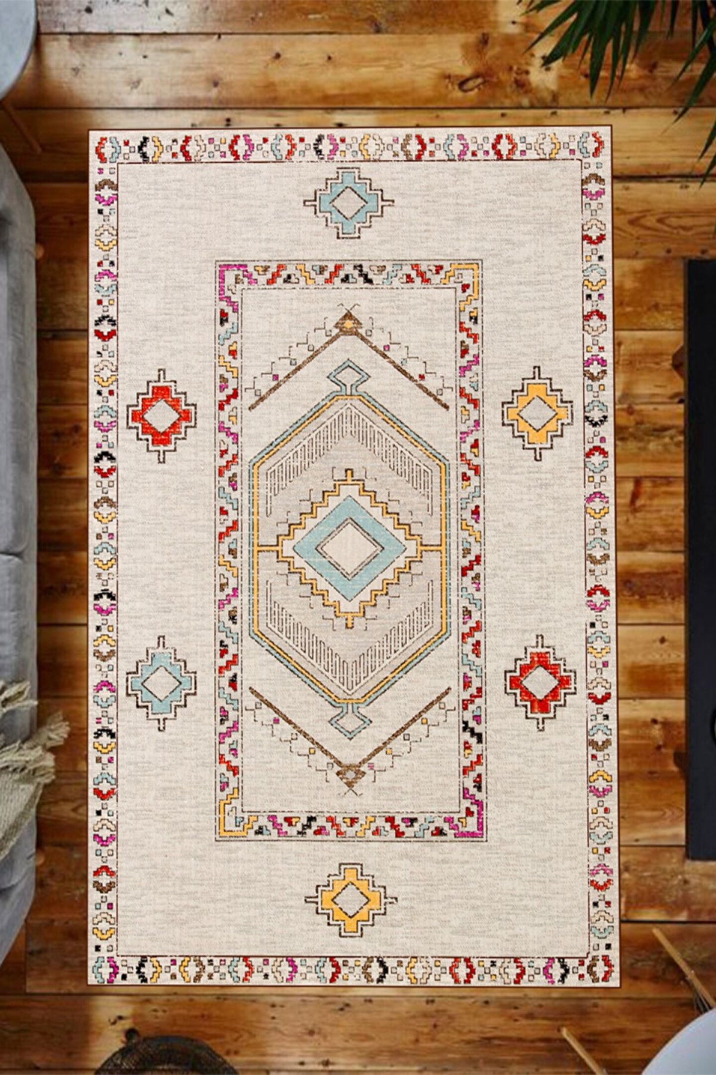 Dijital Baskı Yıkanabilir Kaymaz Taban Krem Zeminli Klasik Kilim Desenli Yolluk Halı