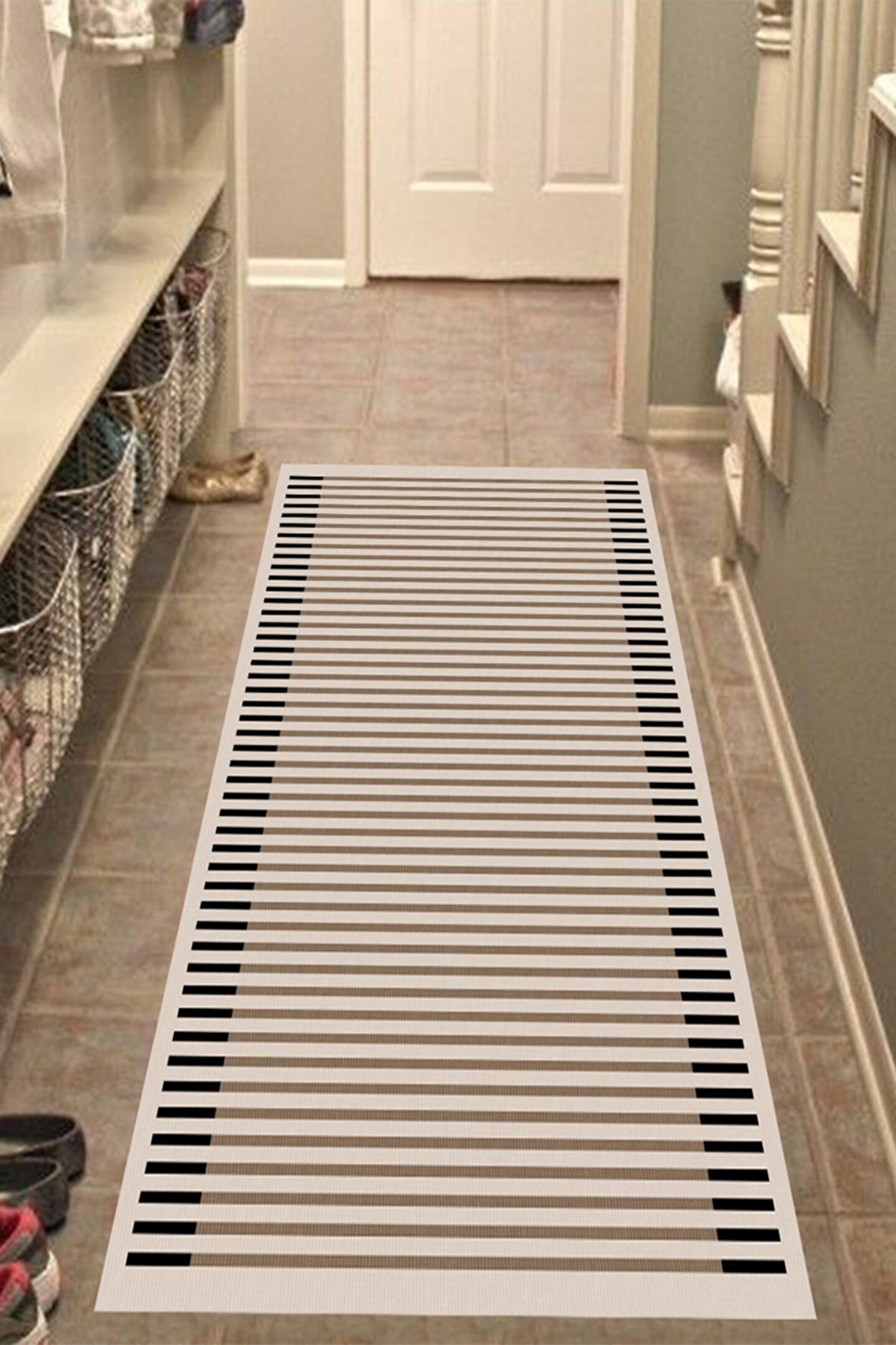 Dijital Baskı Yıkanabilir Kaymaz Taban Krem Zeminli Yatay Çizgili Yolluk Halı