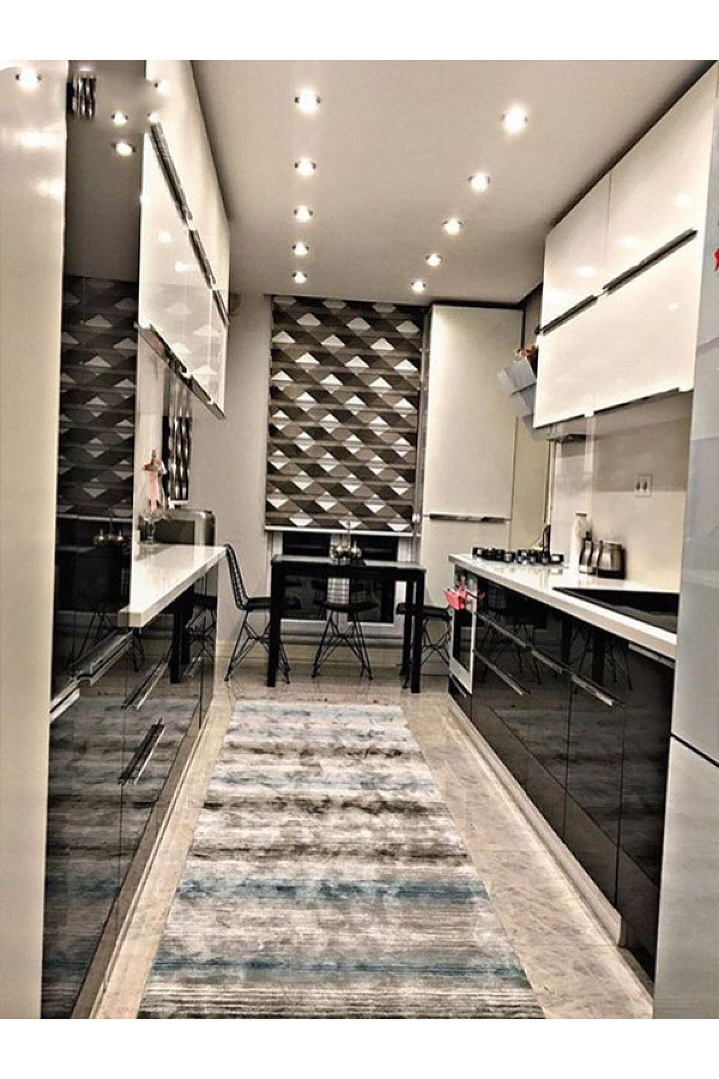 Dijital Baskı Yıkanabilir Kaymaz Taban Mavi & Beyaz Kahveli Modern Halı Mutfak Halısı