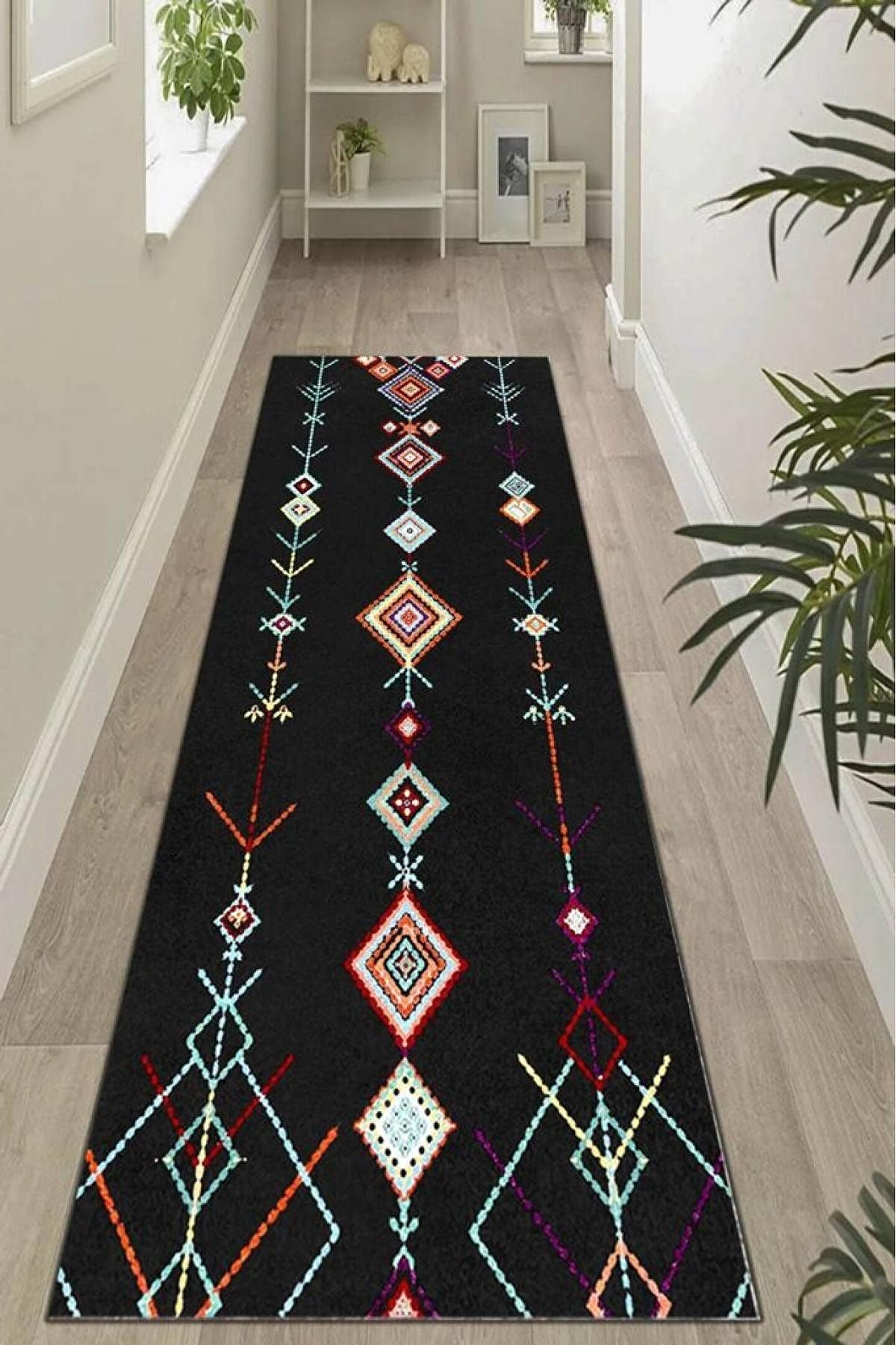 Dijital Baskı Yıkanabilir Kaymaz Taban Siyah Zemin Renkli Motifli Yolluk Halı